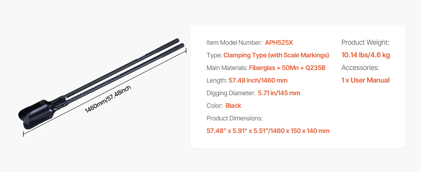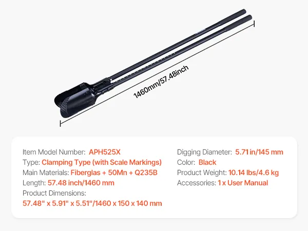 This post hole digger is ideal for gardening and farming, easily digging 5.71"/145 mm round holes. The fiberglass handle and wave-shaped blade cut tough soil, while the 57.48"/1460 mm length reduces bending. Lightweight, portable, and ready to use, it enhances work efficiency.