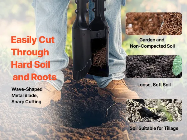 Our heavy duty post hole digger features a metal blade made of high-quality 50Mn carbon steel, which easily cuts through tough soil and stubborn roots, enhancing your gardening efficiency. It is designed specifically for loose soil and cultivable land.