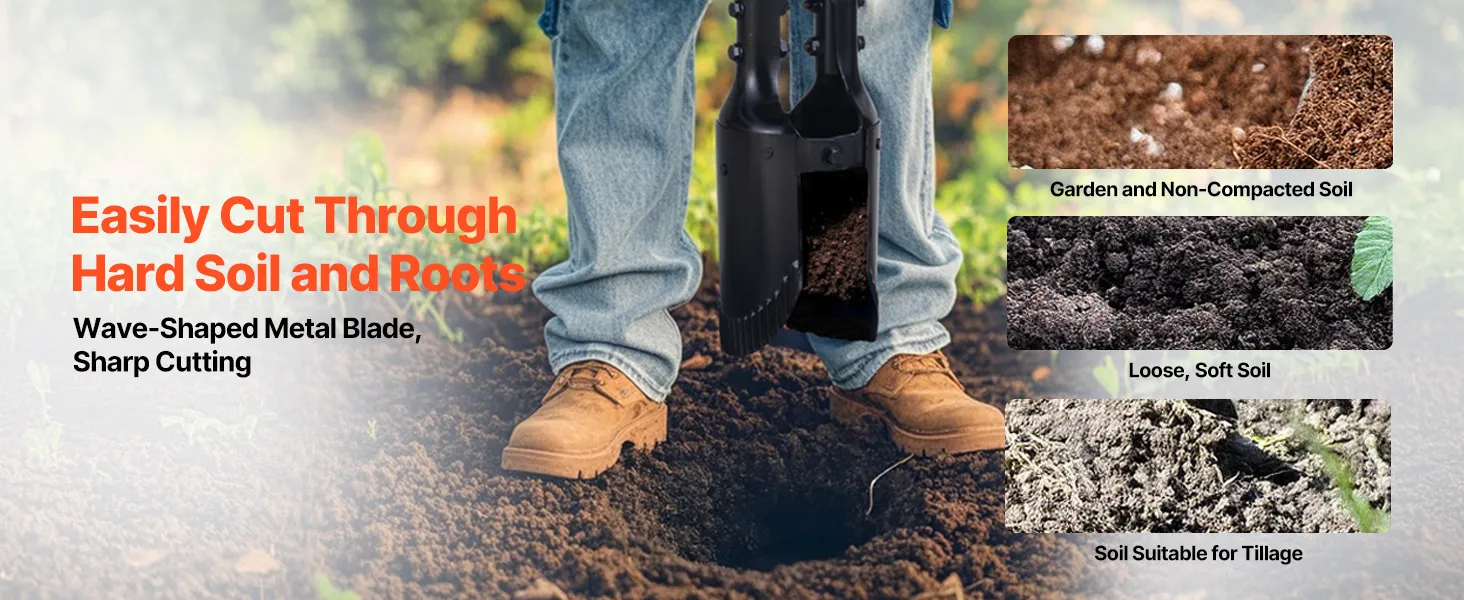 Durable and Sturdy: The handle of our post hole digger is made from high-strength fiberglass, 0.12-inch/3 mm thick, paired with a 50Mn steel metal blade. It's suitable for various soil types, such as loose soft soil and cultivable land.