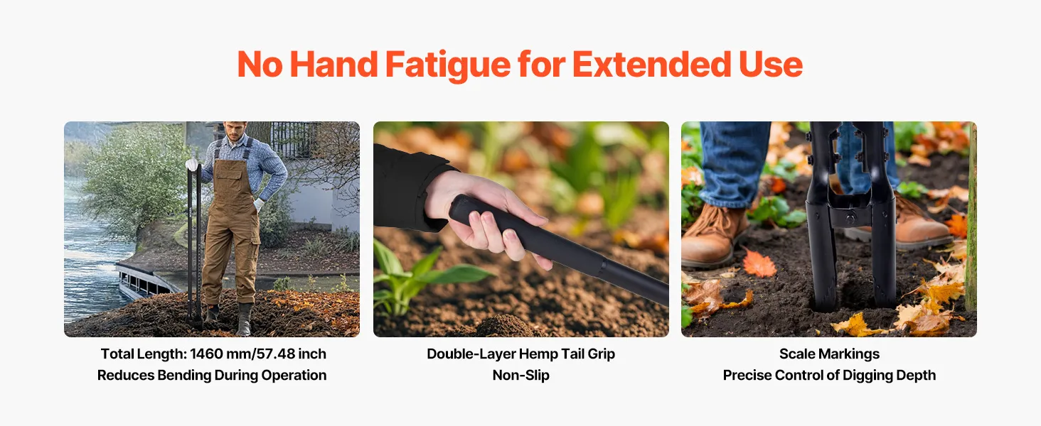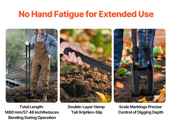 With a total length of 57.48 in/1460 mm, our manual hole digger reduces frequent bending. The double-layer hemp tail sleeve enhances grip comfort, and clear scale markings help you accurately gauge hole depth during digging.