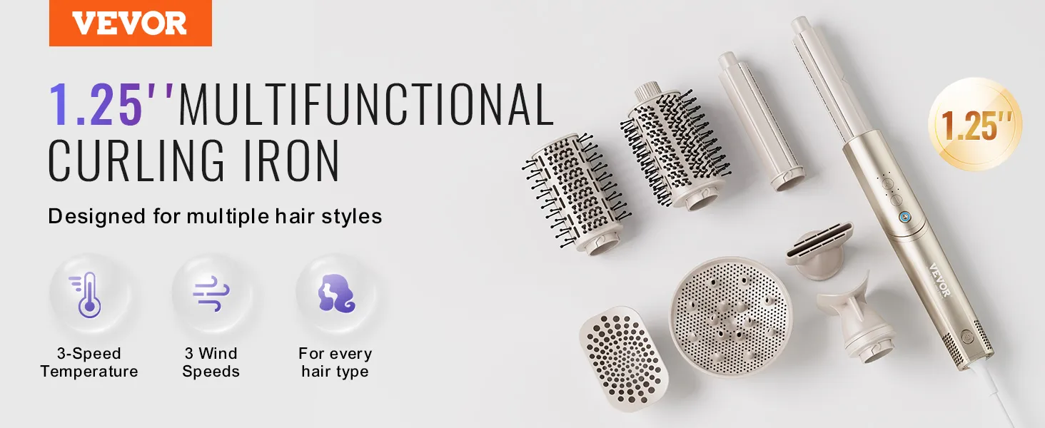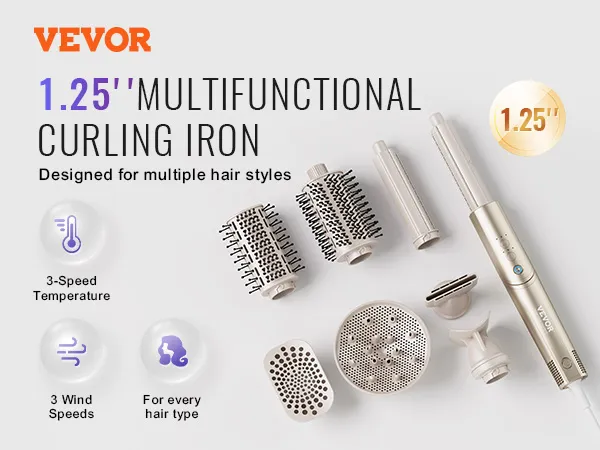 VEVOR 8-in-1 krultang, 1,25-inch keramische krultangset met 2 cilinders, 2 borstels, 4 mondstukken voor droog/steil/krullend/volumineus haar, krultang voor lang, halflang en kort haar, voor alle haartypen