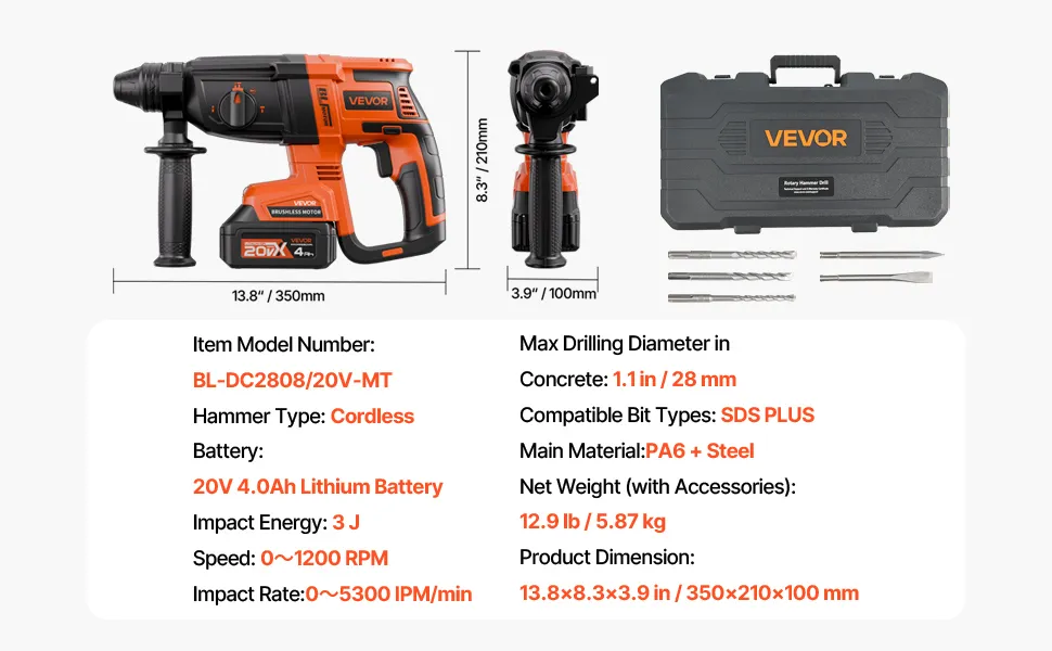 Veelzijdige set: Deze set elektrisch gereedschap bevat 3 boren, 1 platte beitel, 1 puntbeitel, 1 lithiumbatterij, 1 lader en een draagbare draagtas. Regelmatig smeren zorgt voor een soepele werking en verlengt de levensduur van het gereedschap. Of u nu tegels verwijdert of bakstenen muren sloopt, deze boorhamer maakt het werk moeiteloos. Ideaal voor hout, metselwerk, beton, baksteen en metaal – geschikt voor zowel professioneel als thuisgebruik.