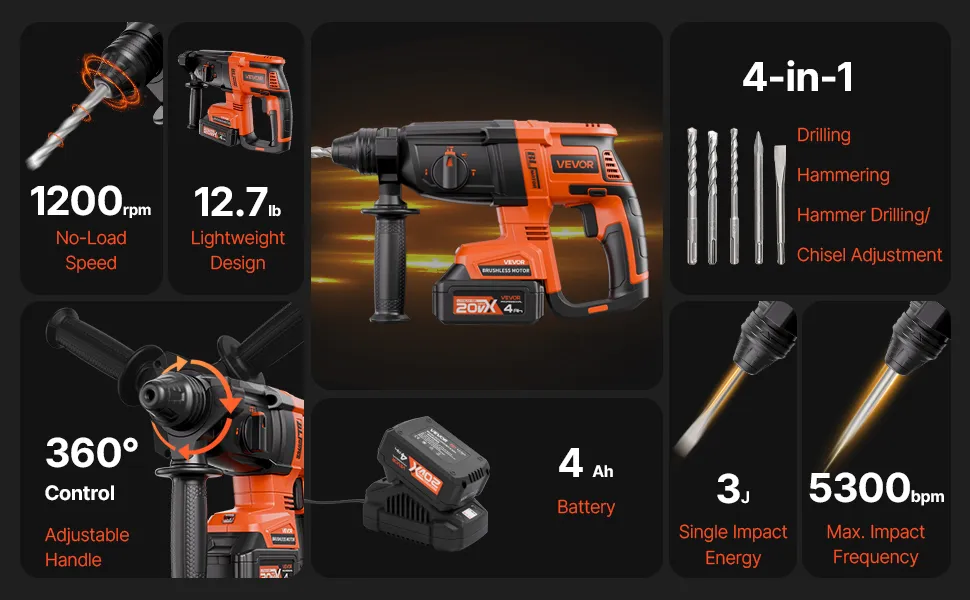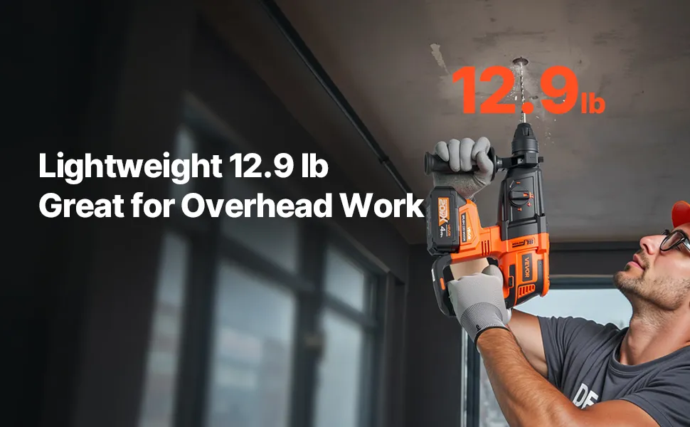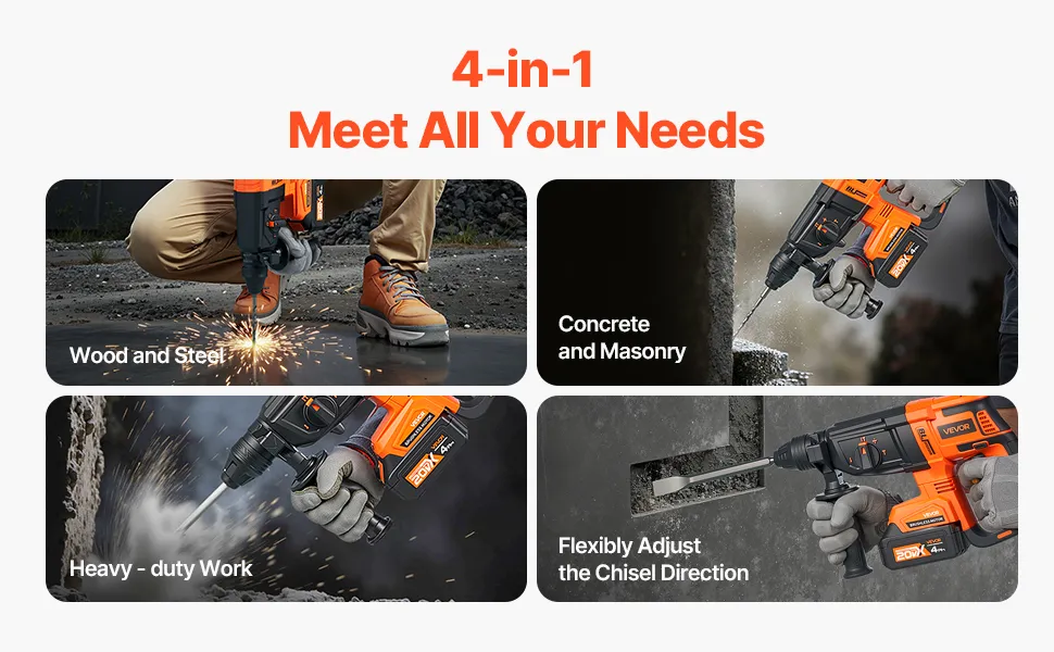 4-in-1 functionaliteit: Met vier eenvoudig te schakelen standen – alleen boren (voor hout en staal), alleen hameren (voor beton en baksteen), klopboren (voor zwaar werk) en beitelen – past deze accuboorhamer zich aan uw projectbehoeften aan. Dubbele schakelaars verlengen de levensduur van het gereedschap in vergelijking met enkele schakelaars en zorgen voor een betrouwbaardere werking.