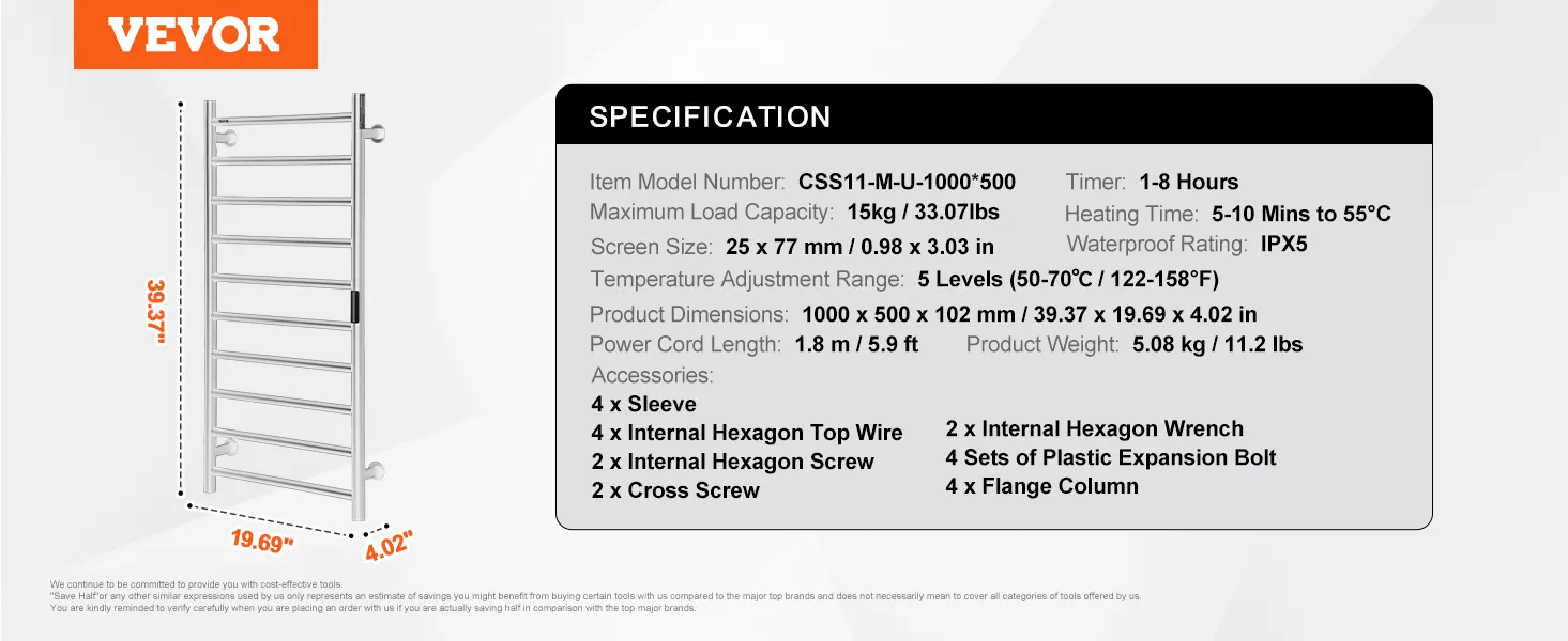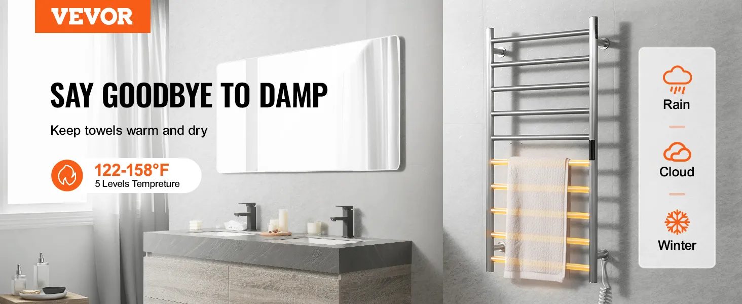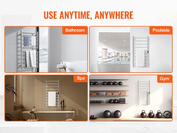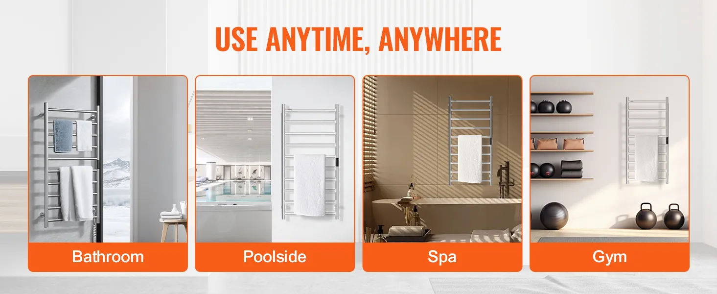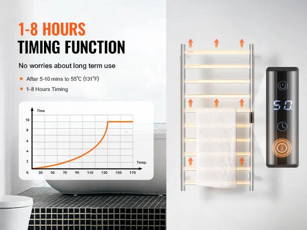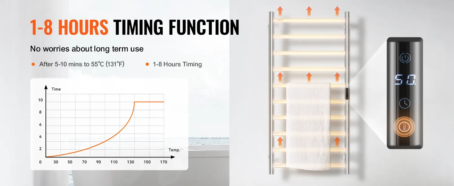 Smart Timer: The heated towel rack comes with a built-in timer, allowing you to set heating times from 1 to 8 hours according to your needs. This feature eliminates safety concerns associated with prolonged use and saves you time and effort.