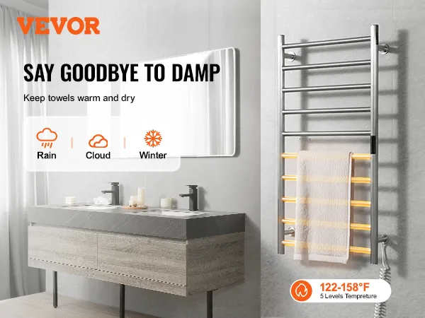 Rapid Heating: This towel warmer rack heats up to 131°F/55°C in just 5-10 minutes, ensuring efficient drying. With a 5-level temperature adjustment feature, you can set the temperature to your preferred level for optimal drying results.