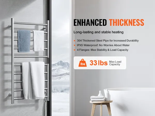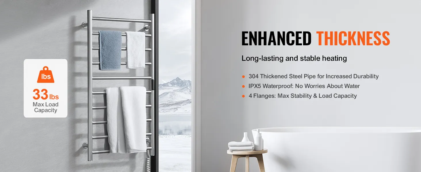 The towel warmer rack is designed to heat various garments simultaneously, with a maximum load capacity of 33 lbs, meeting all your needs.