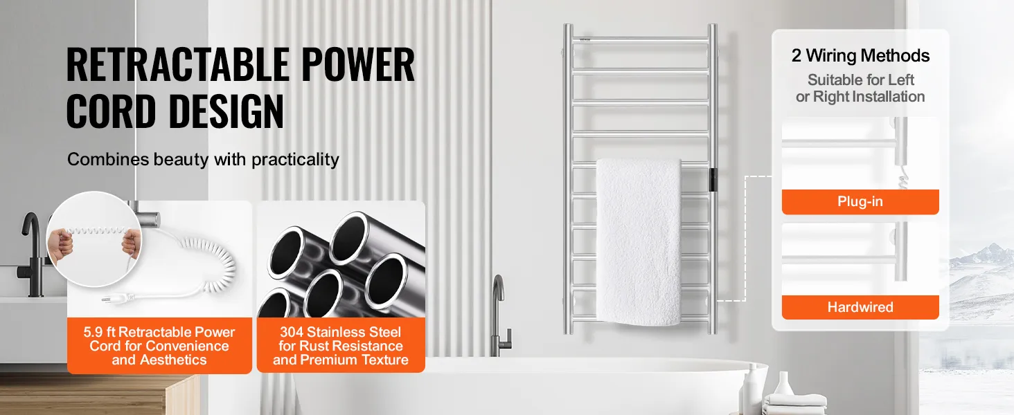 High Quality: Built with a thick wall design, this towel warmer is durable and provides consistent heating. Its neat left and right wiring layout enhances the product’s appearance and ensures a clean look.