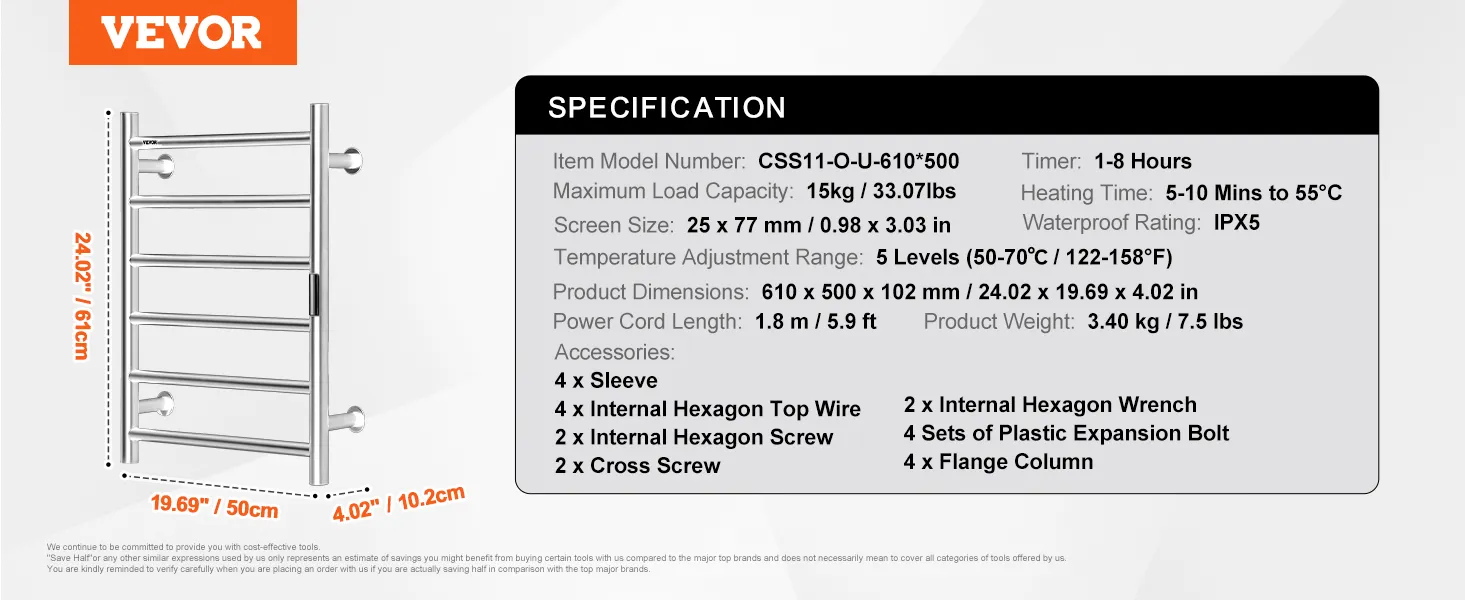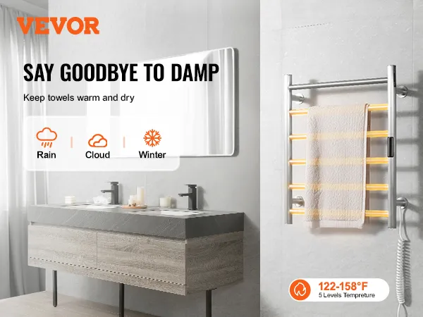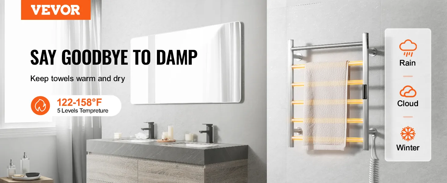 VEVOR 6 Bars Towel Warmer Rack, Wall Mounted Heated Towel Rack for Bathroom, IPX5 Waterpoof Towel Heater Rack with Timer & LED Display Screen, 5 Levels Adjustable Temperature Towel Heater, Silver VEVOR 6 Bars Towel Warmer Rack, Wall Mounted Heated Towel Rack for Bathroom, IPX5 Waterpoof Towel Heater Rack with Timer & LED Display Screen, 5 Levels Adjustable Temperature Towel Heater, Silver