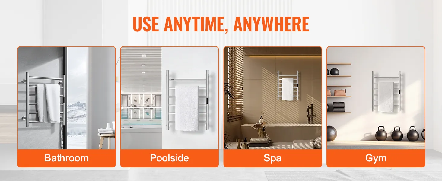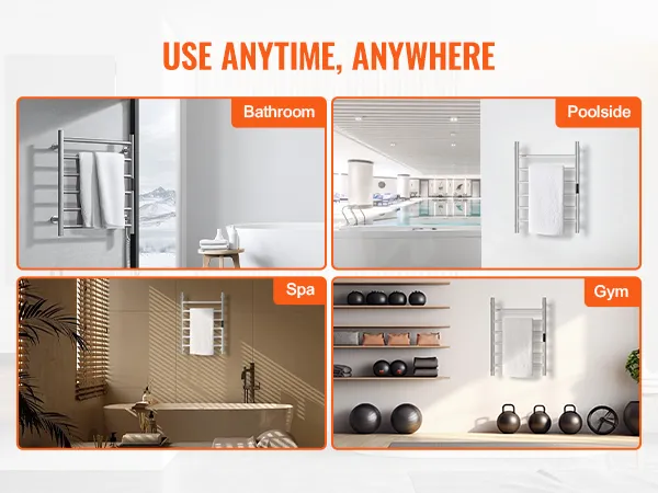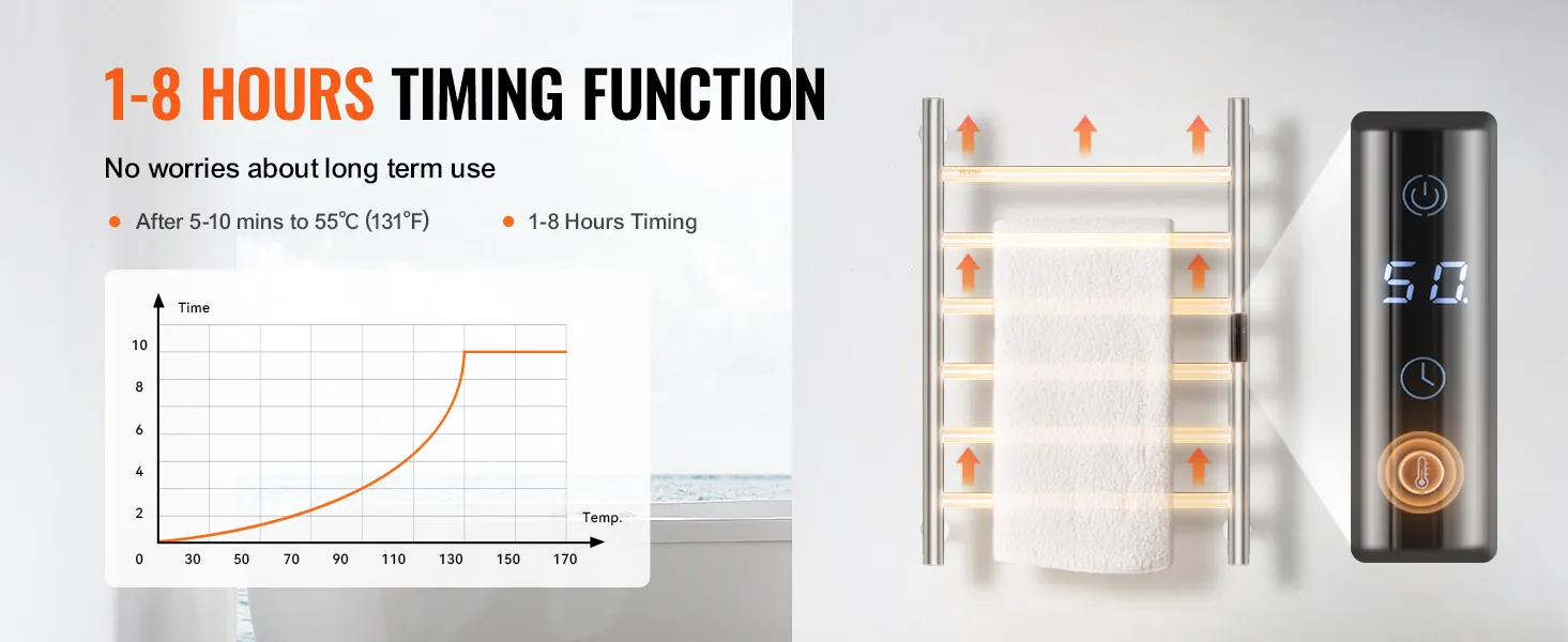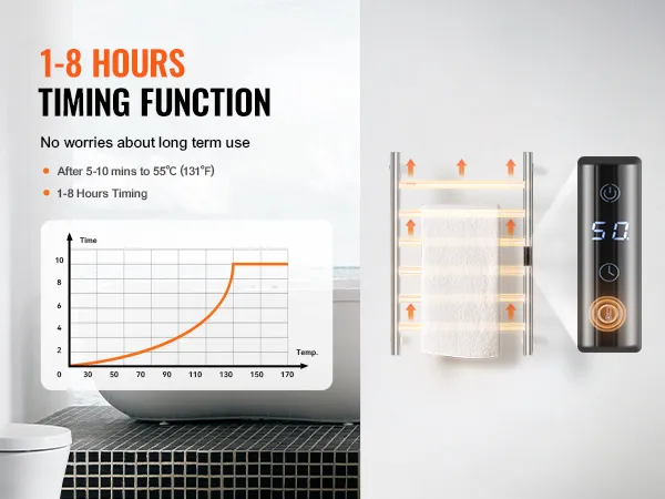 • Smart Timer: The heated towel rack comes with a built-in timer, allowing you to set heating times from 1 to 8 hours according to your needs. This feature eliminates safety concerns associated with prolonged use and saves you time and effort.