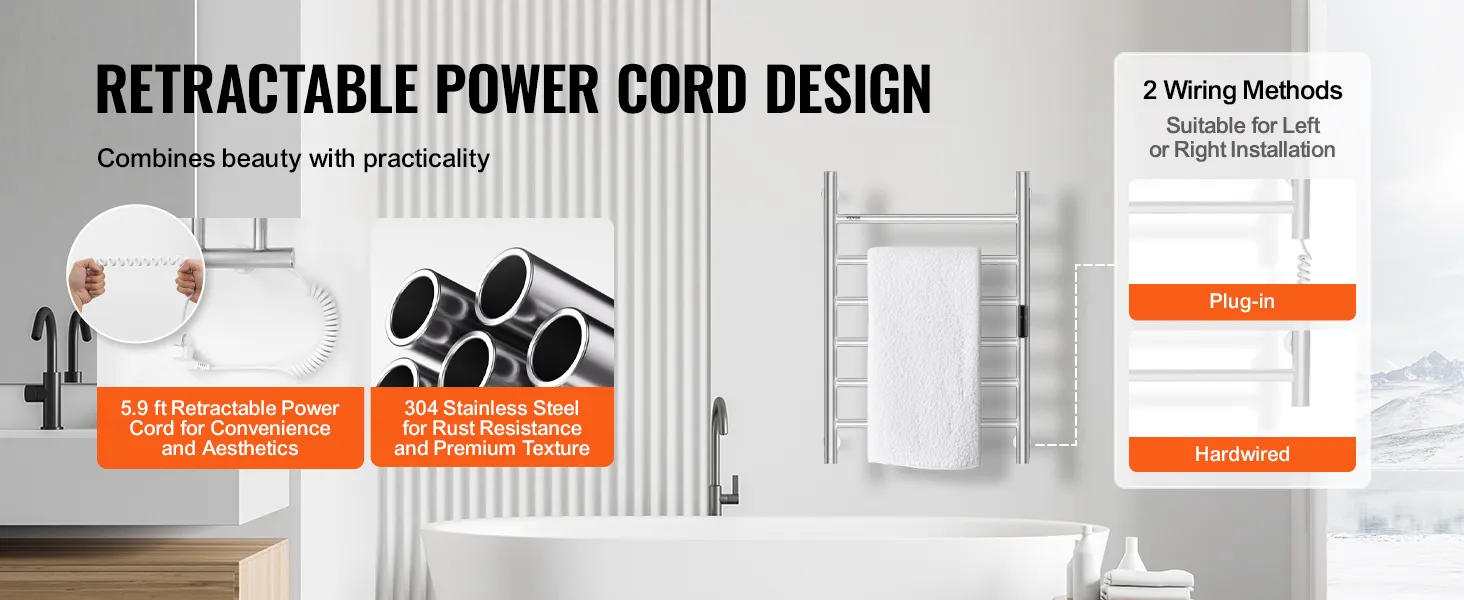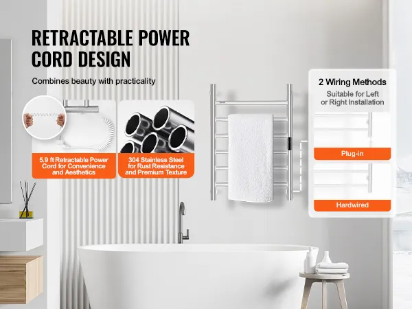 • High Quality: Built with a thick wall design, this towel warmer is durable and provides consistent heating. Its neat left and right wiring layout enhances the product’s appearance and ensures a clean look.