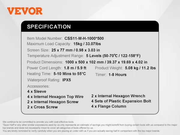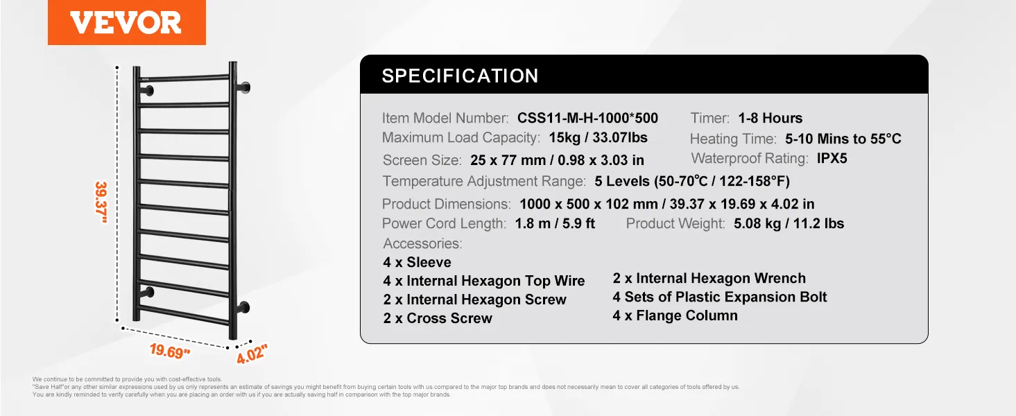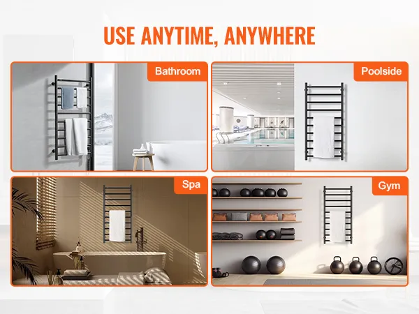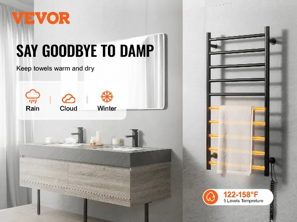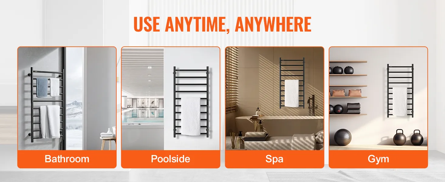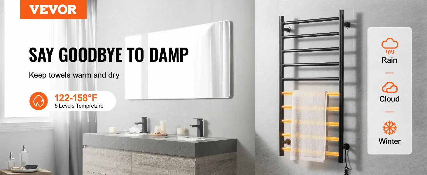 VEVOR 10 Bars Towel Warmer Rack, Wall Mounted Heated Towel Rack for Bathroom, IPX5 Waterpoof Towel Heater Rack with Timer & LED Display Screen, 5 Levels Adjustable Temperature Towel Heater, Black VEVOR 10 Bars Towel Warmer Rack, Wall Mounted Heated Towel Rack for Bathroom, IPX5 Waterpoof Towel Heater Rack with Timer & LED Display Screen, 5 Levels Adjustable Temperature Towel Heater, Black