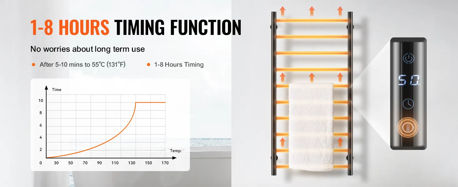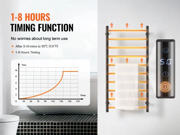 • Smart Timer: The heated towel rack comes with a built-in timer, allowing you to set heating times from 1 to 8 hours according to your needs. This feature eliminates safety concerns associated with prolonged use and saves you time and effort.