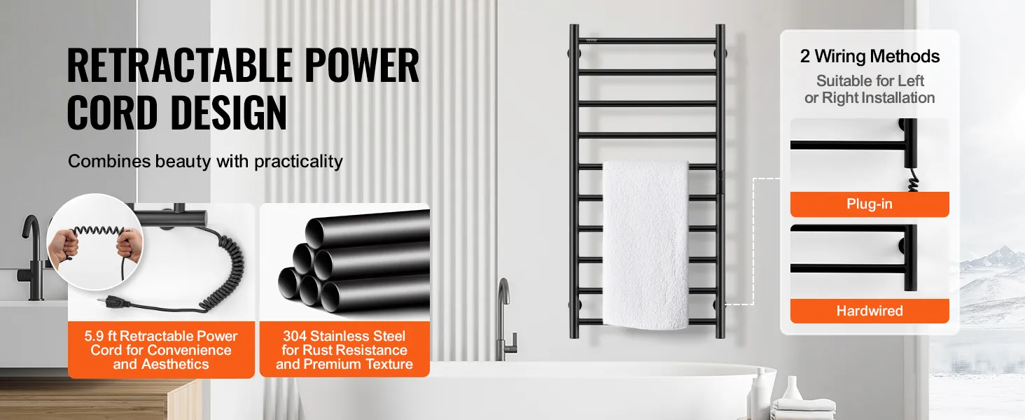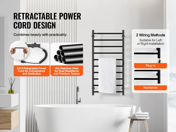 • High Quality: Built with a thick wall design, this towel warmer is durable and provides consistent heating. Its neat left and right wiring layout enhances the product’s appearance and ensures a clean look.