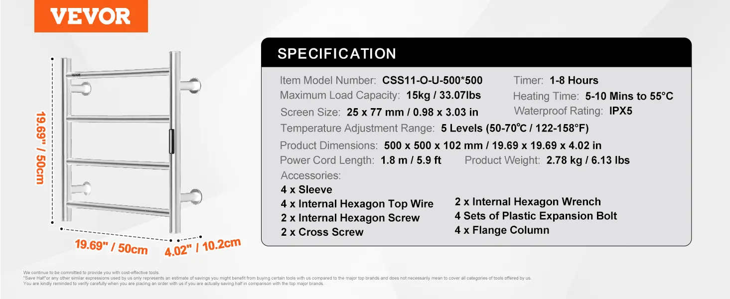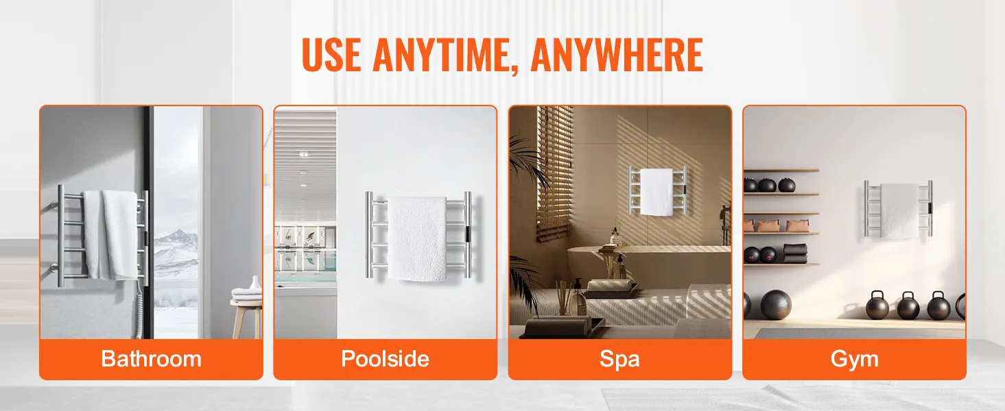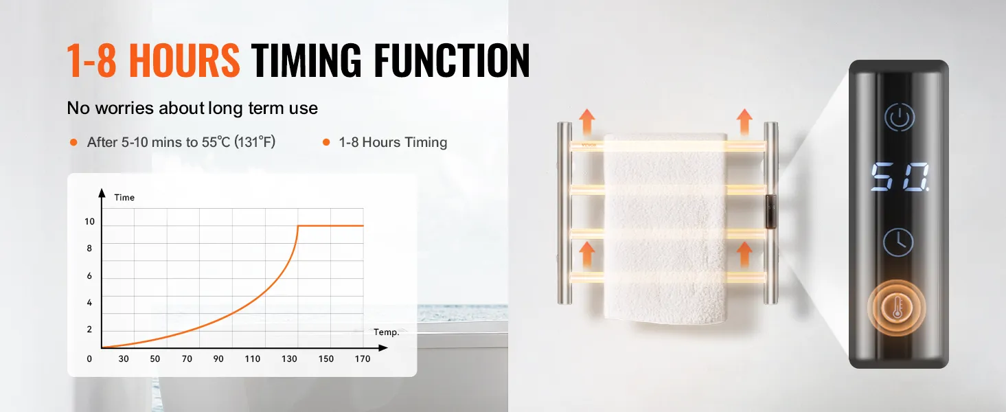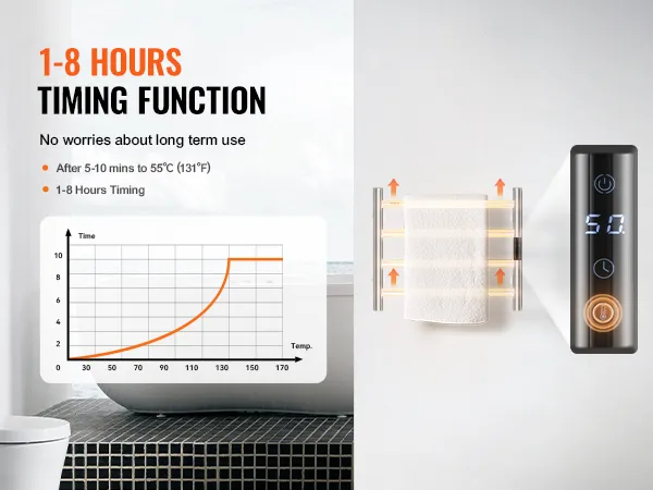 • Smart Timer: The heated towel rack comes with a built-in timer, allowing you to set heating times from 1 to 8 hours according to your needs. This feature eliminates safety concerns associated with prolonged use and saves you time and effort.