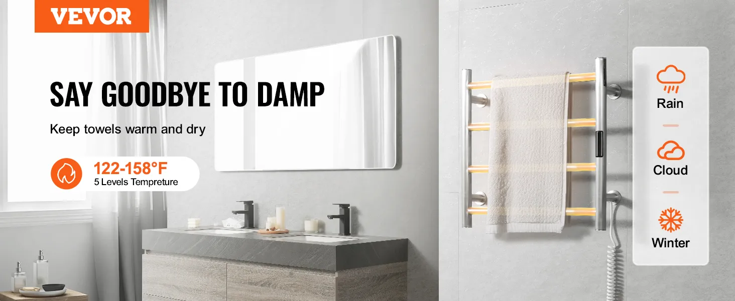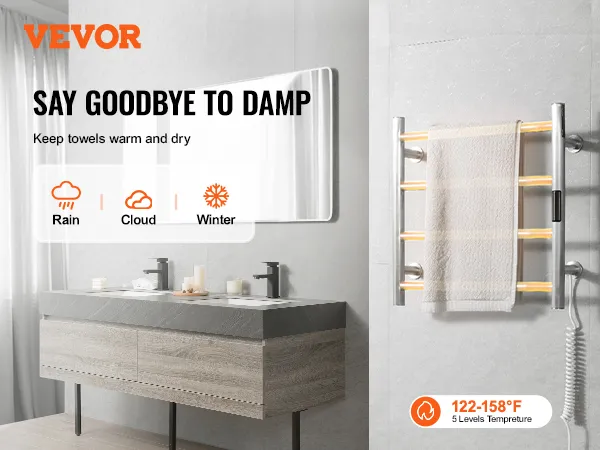 VEVOR 4 Bars Towel Warmer Rack, Wall Mounted Heated Towel Rack for Bathroom, IPX5 Waterpoof Towel Heater Rack with Timer & LED Display Screen, 5 Levels Adjustable Temperature Towel Heater, Silver VEVOR 4 Bars Towel Warmer Rack, Wall Mounted Heated Towel Rack for Bathroom, IPX5 Waterpoof Towel Heater Rack with Timer & LED Display Screen, 5 Levels Adjustable Temperature Towel Heater, Silver