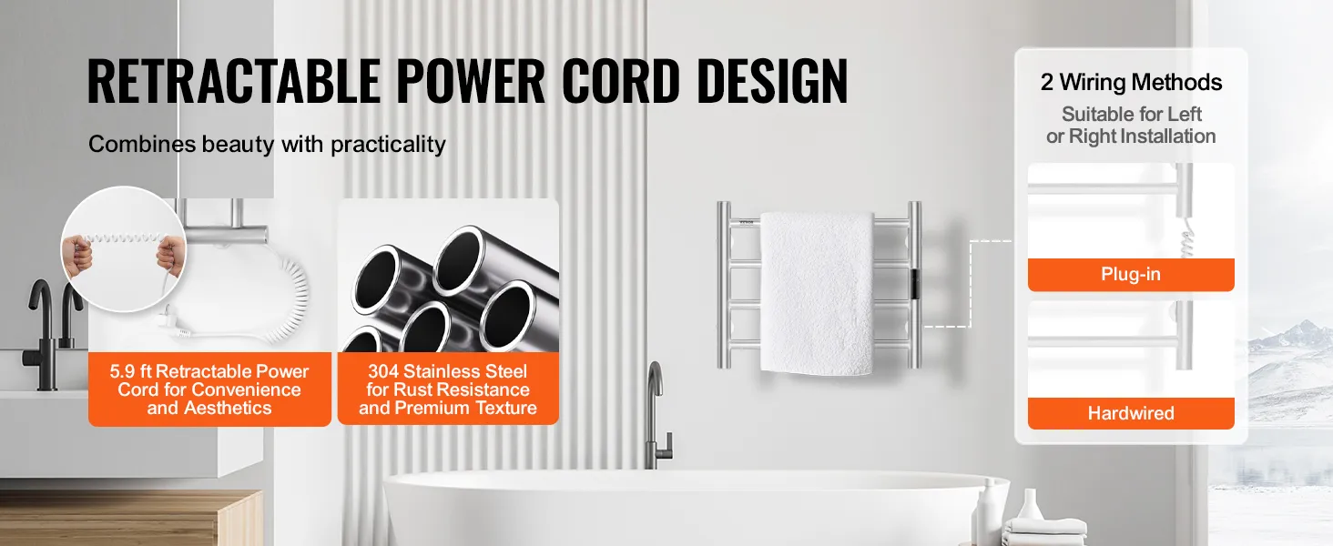 • High Quality: Built with a thick wall design, this towel warmer is durable and provides consistent heating. Its neat left and right wiring layout enhances the product’s appearance and ensures a clean look.