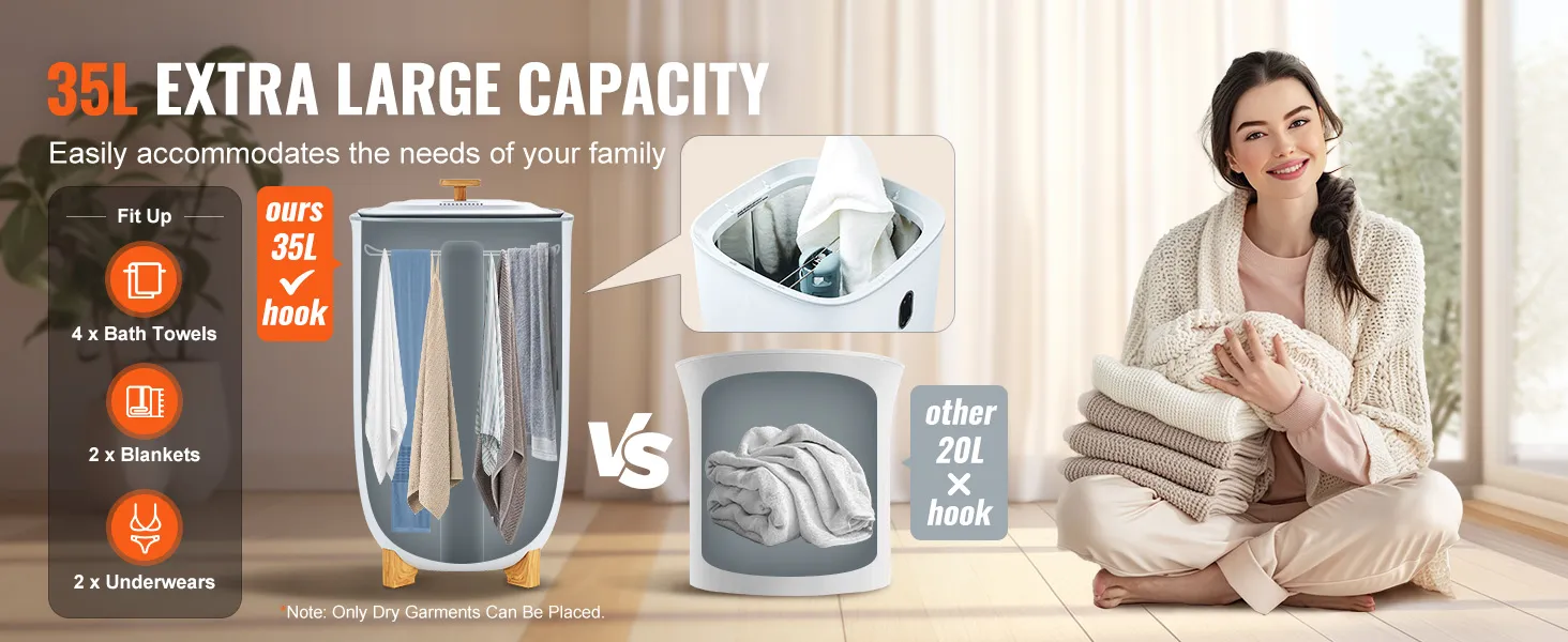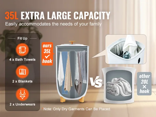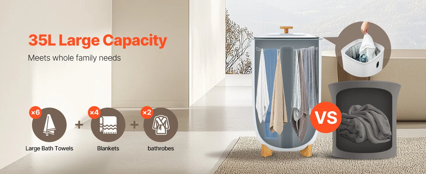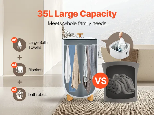 Grote capaciteit: met een extra grote inhoud van 35 liter biedt de handdoekverwarmer voor de badkamer plaats aan 4 grote handdoeken (177,8 x 101,6 cm), badjassen, dekens, pyjama's enz. Het haakontwerp in de binnenkant vergemakkelijkt het ophangen .