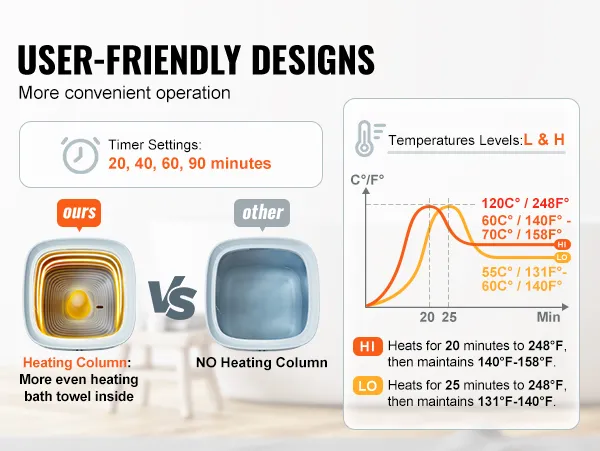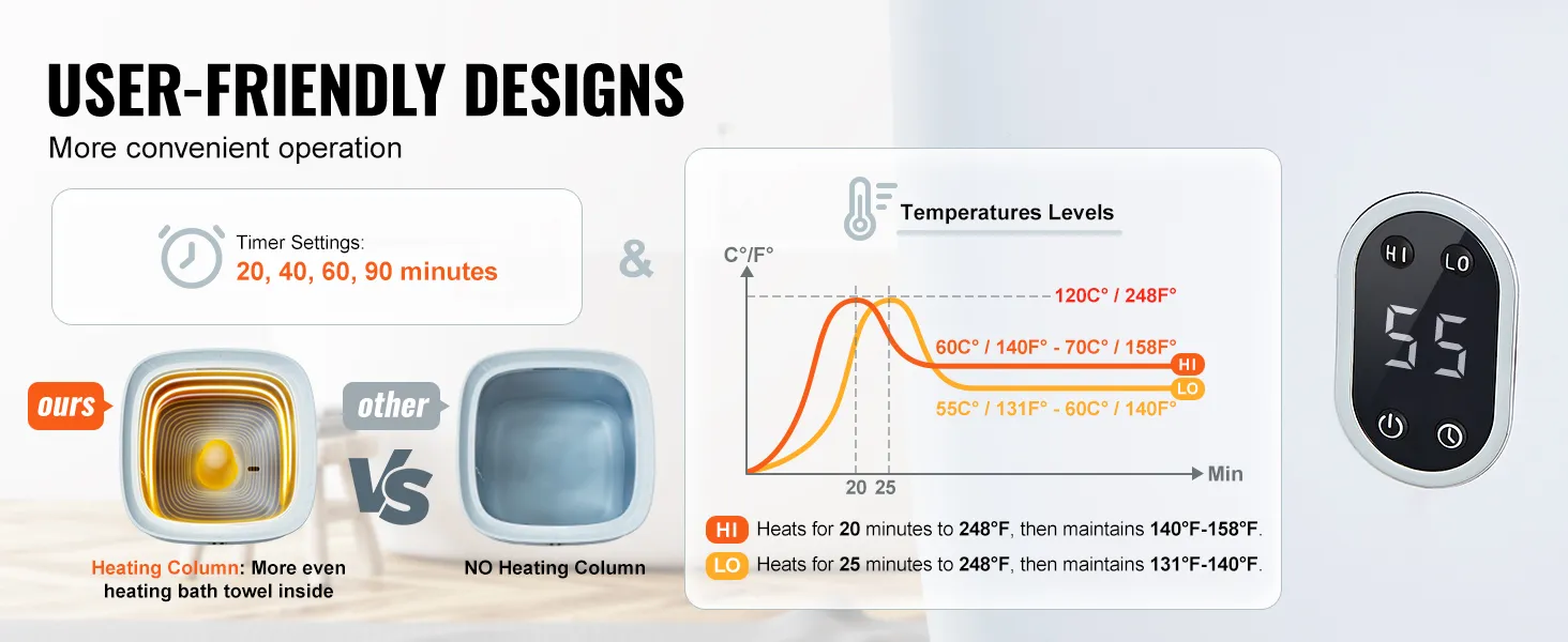 Comfortabele bediening: De handdoekverwarmer heeft een gebruiksvriendelijk bedieningsconcept. Je kunt kiezen uit 4 timerinstellingen (20, 40, 60, 90 minuten). De hoge en lage modi bieden flexibiliteit, afhankelijk van uw behoeften.