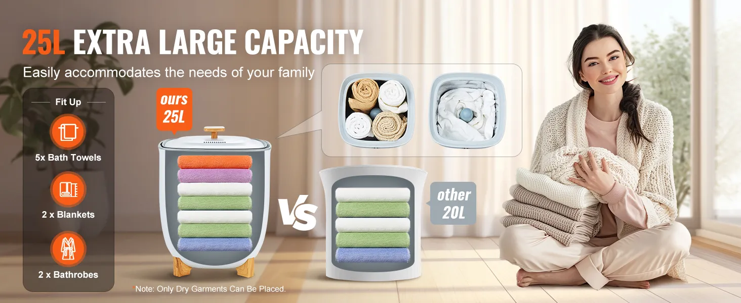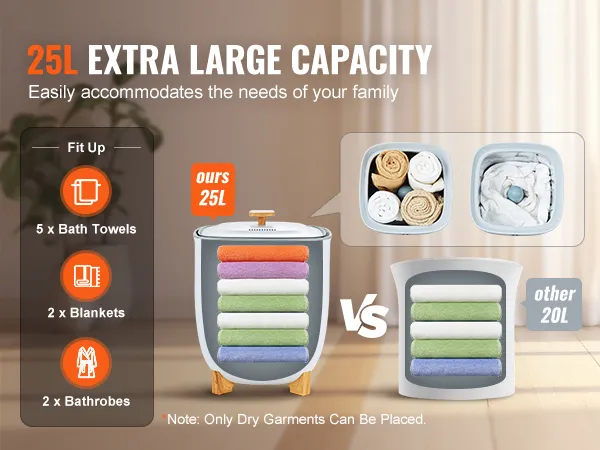 Grote capaciteit: de handdoekverwarmer met een inhoud van 25 liter biedt plaats aan twee grote handdoeken, badjassen, dekens, pyjama's etc. (177,8 x 101,6 cm). Als alternatief kunnen er ook ca. 6 middelgrote badhanddoeken in worden geplaatst. Dit maakt het een onmisbaar huishoudelijk apparaat voor grote gezinnen.