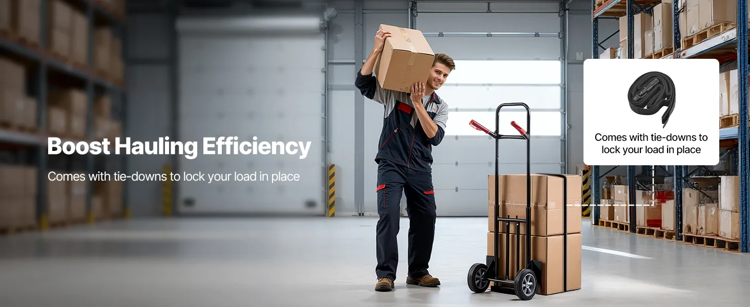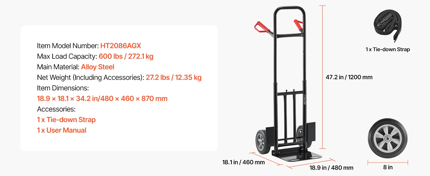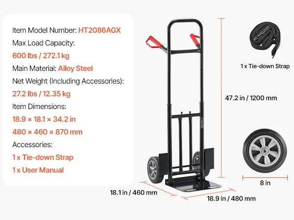 Laadvermogen van 270 kg: Deze zware steekwagen heeft afmetingen van 480 x 469 x 1200 mm, een bodemoppervlak van 320 x 289,5 mm en weegt 12,35 kg. Hij kan tot 272 kg dragen en wordt geleverd met een spanband voor veilig tillen, trekken en transporteren.