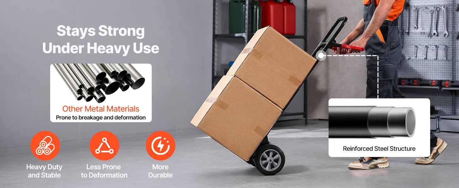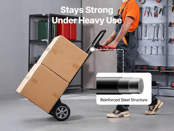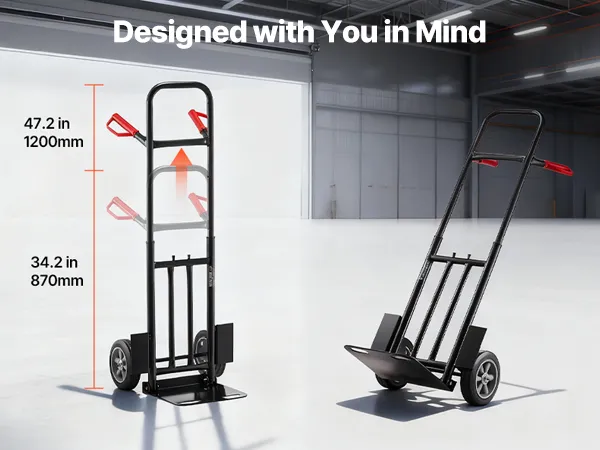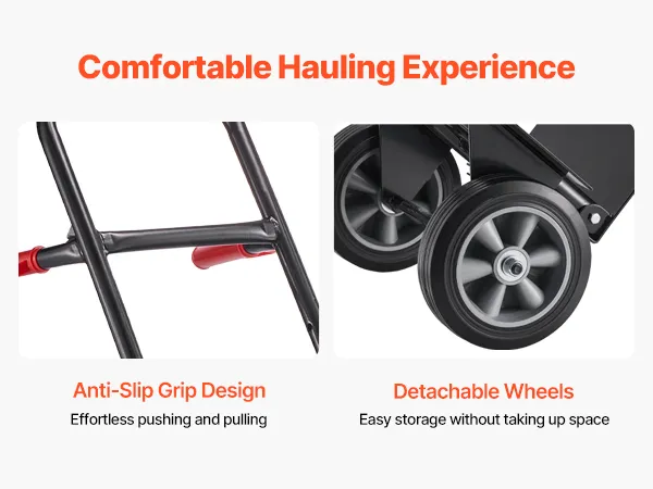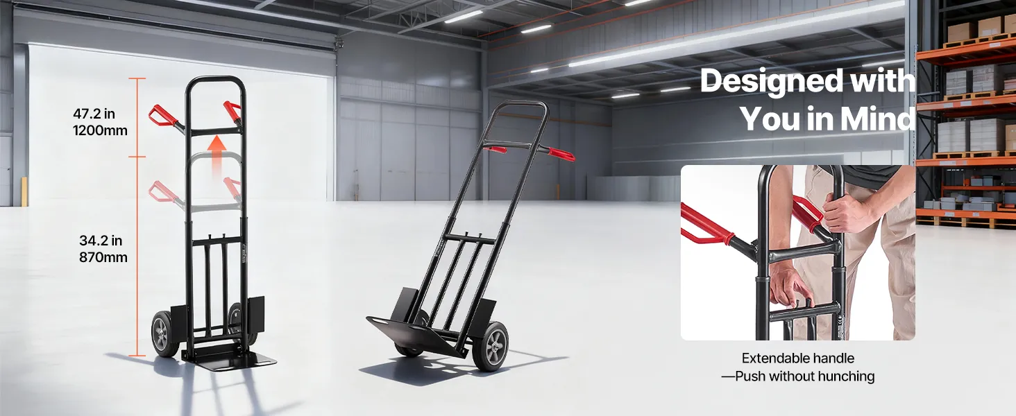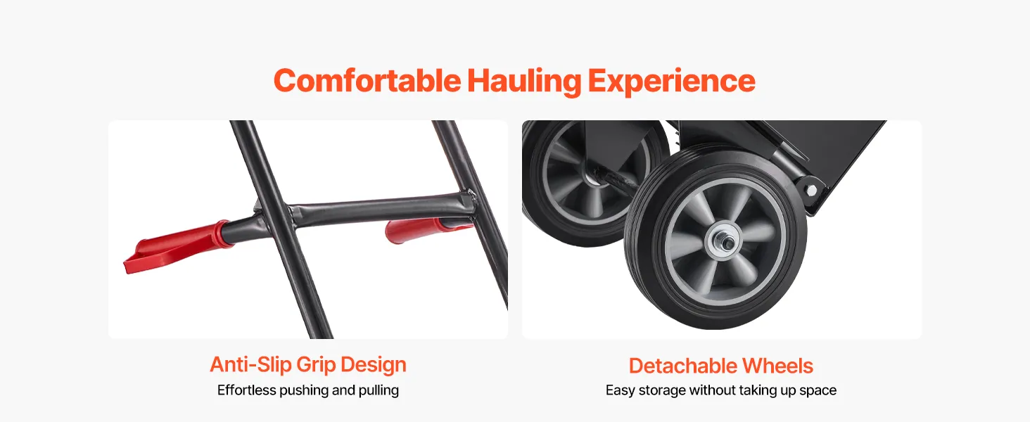 Ergonomisch ontwerp: Deze vrachtwagendolly is voorzien van een ergonomische, antislip siliconen handgreep voor een veilige en comfortabele grip. De verstelbare handgreep is aanpasbaar aan verschillende hoogtes, wat het hanteren gemakkelijker en minder vermoeiend maakt – ideaal voor leveringen, verhuizingen en dagelijks transport.