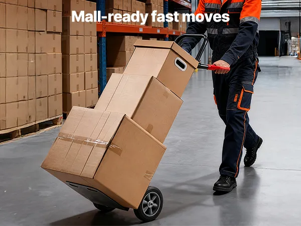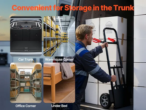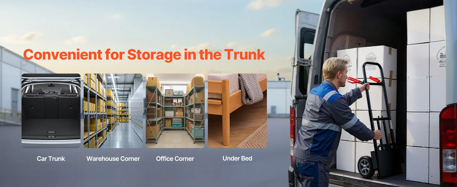 Compact opbergontwerp: Wanneer deze steekwagen niet in gebruik is, past hij gemakkelijk in de kofferbak van een auto of in een opberghoek. Het draagbare, ruimtebesparende ontwerp maakt hem ideaal voor transport binnen en buiten, geschikt voor verhuizingen, kantoren, magazijnen, fabrieken of winkelcentra.
