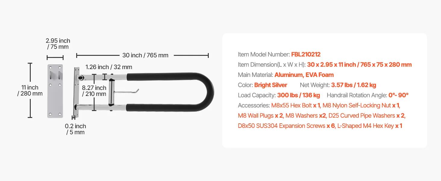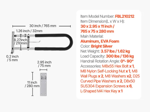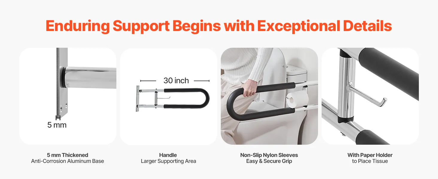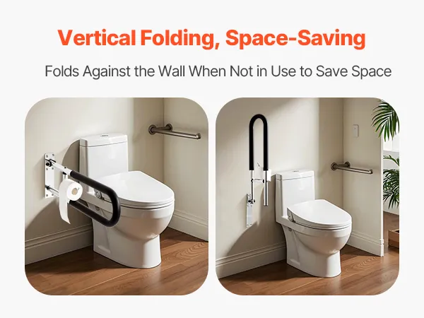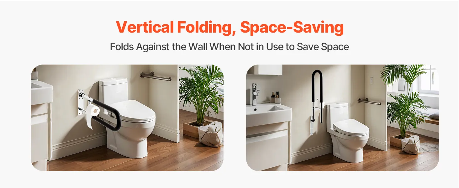 Space Made Efficient: Our toilet grab bar offers 0°–90° rotation functionality. Simply adjust the tightness of the upper and lower screws to easily adjust the handrail angle. When not in use, the handrail can be set to a vertical position, saving valuable space, especially ideal for small bathrooms or other compact spaces