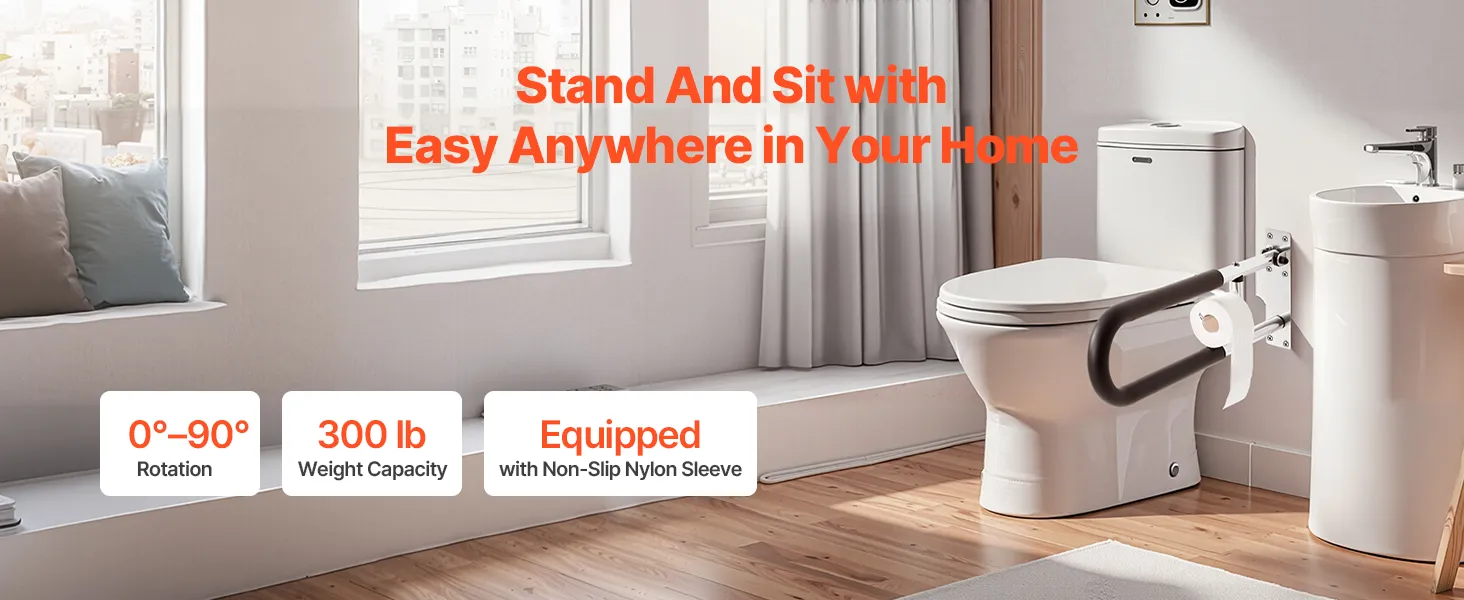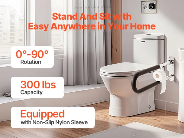 Our flip-up toilet safety handrail has a robust support capacity of 300 lbs, offering assistance in bedroom, bathroom, restroom, etc. It rotates 0°-90°, allowing adjust to vertical position, saving space without compromising on safety. Just rotate the screws, and get the needed position easily.