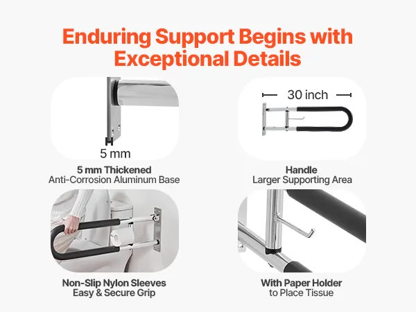 The toilet grab bar delivers steadfast support, enabling secure and stable sitting or standing. The thickened tube and non-slip nylon sleeves ensure a smooth and safe use. Made from high-strength metal with an extended support range and a paper holder, the bar offers ideal support and convenience.