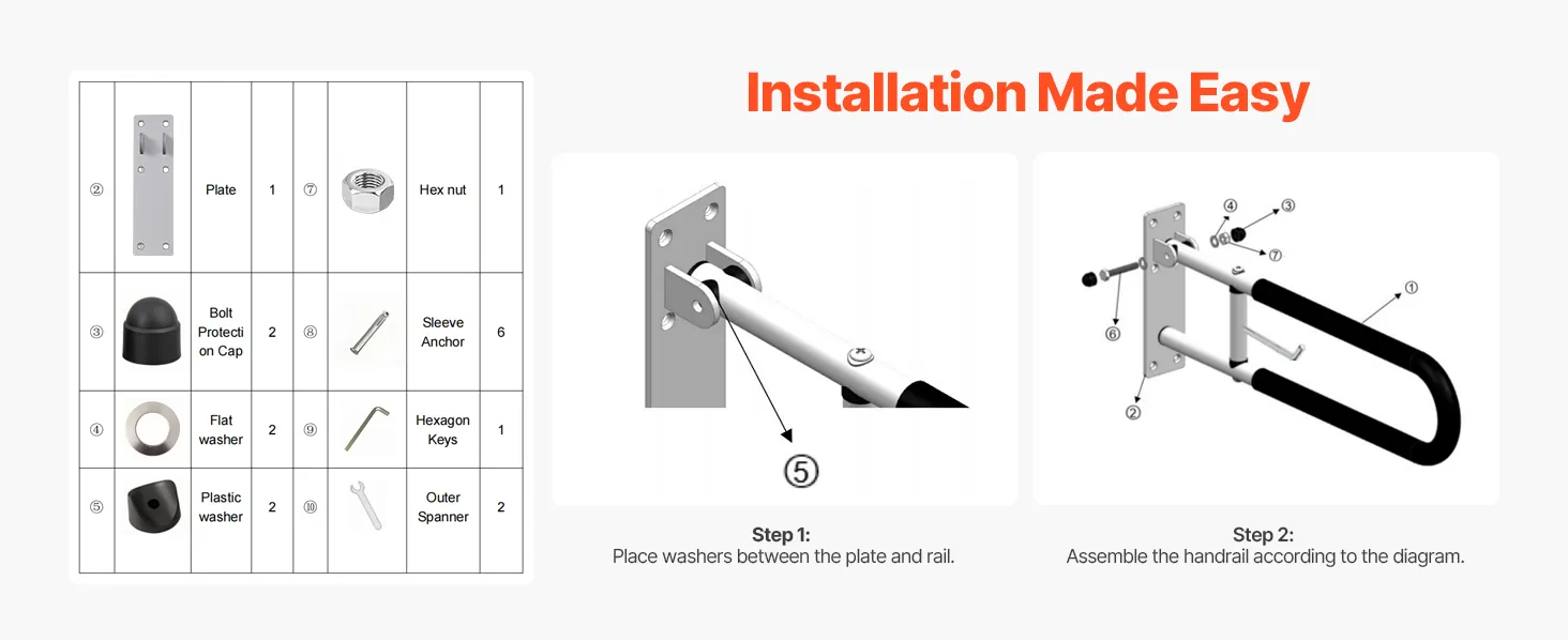 Our transfer pole comes with a complete set of assembly accessories. The straightforward screw rotation assembly allows for quick installation without drilling. To ensure safety and convenience, measure the installation distance beforehand to confirm it falls within the effective support range.