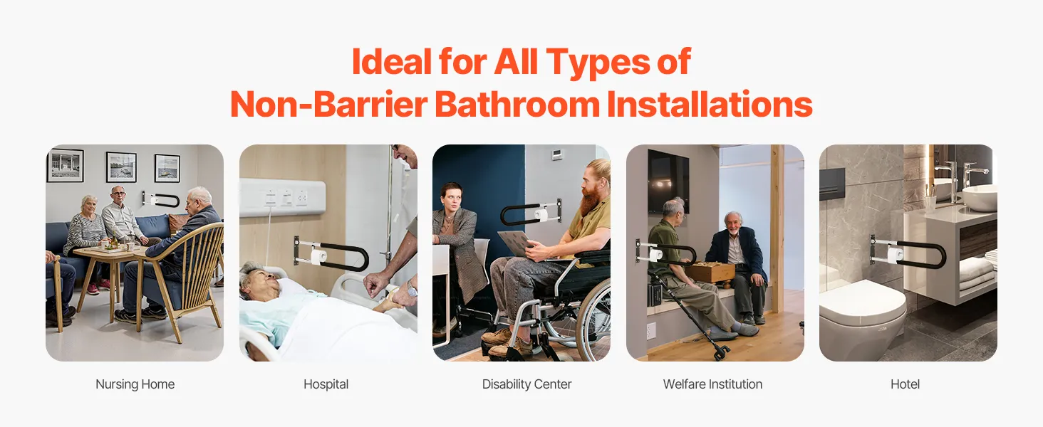 Designed as a non-barrier safety transfer bar for individuals with disabilities or leg injuries, our handrails are not only ideal for home bathrooms but also suitable for use in nursing homes, hospitals, disability centers, welfare institutions, and hotel bathrooms.