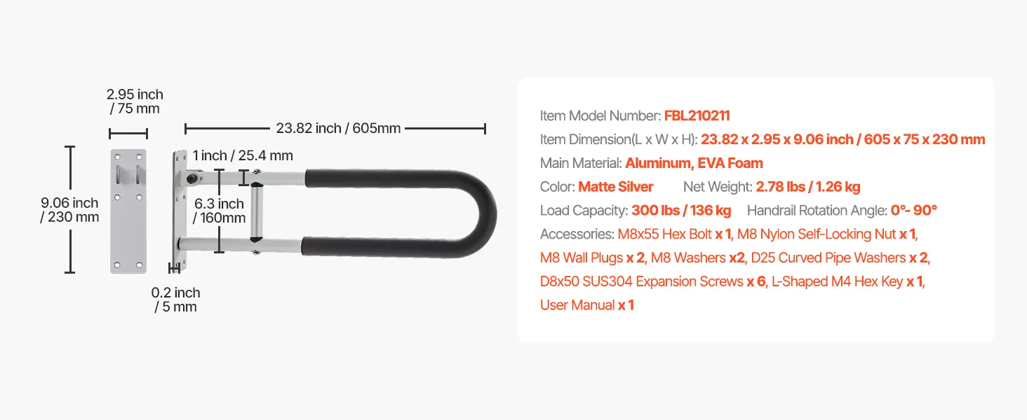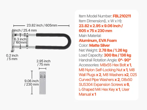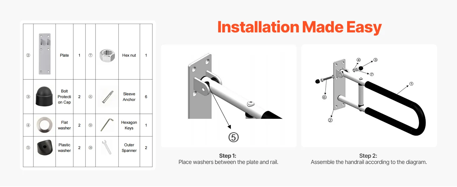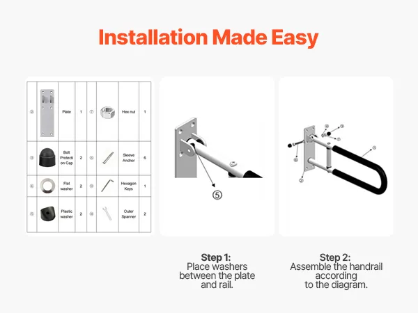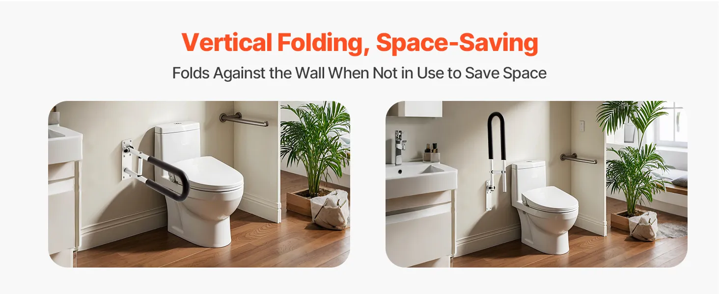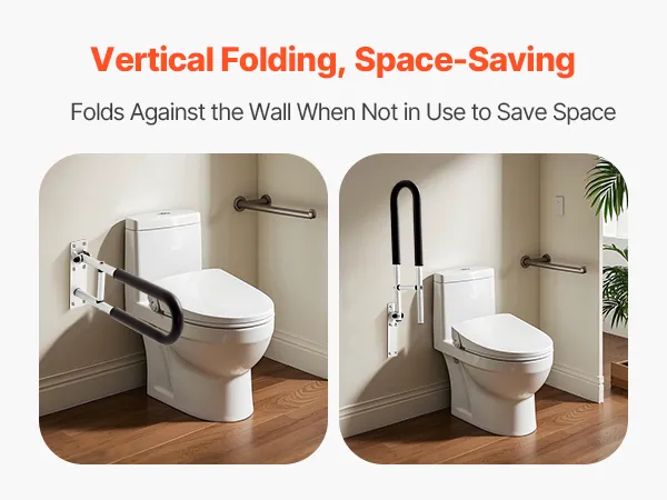 Space Made Efficient: Our toilet grab bar offers 0°–90° rotation functionality. Simply adjust the tightness of the upper and lower screws to easily adjust the handrail angle. When not in use, the handrail can be set to a vertical position, saving valuable space, especially ideal for small bathrooms or other compact spaces