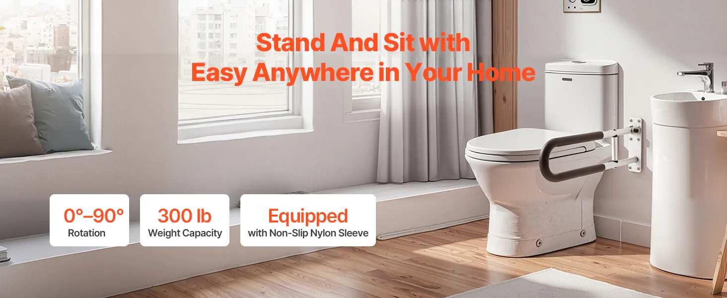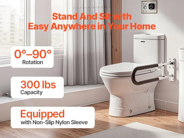 Our flip-up toilet safety handrail has a robust support capacity of 300 lbs, offering assistance in bedroom, bathroom, restroom, etc. It rotates 0°-90°, allowing adjust to vertical position, saving space without compromising on safety. Just rotate the screws, and get the needed position easily.