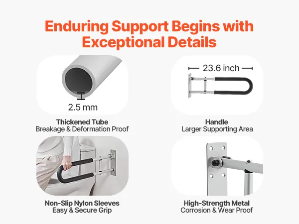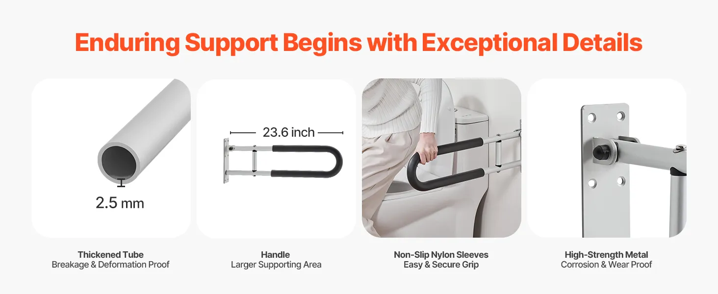 Our toilet grab bar delivers steadfast support, enabling secure and stable sitting or standing. The thick-walled tube and non-slip nylon sleeves ensure a smooth and safe use. Made from high-strength metal with an extended support range, this grab bar offers enduring support and added convenience.