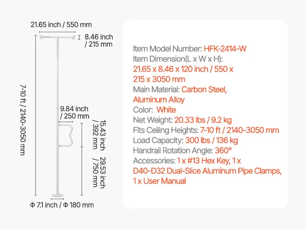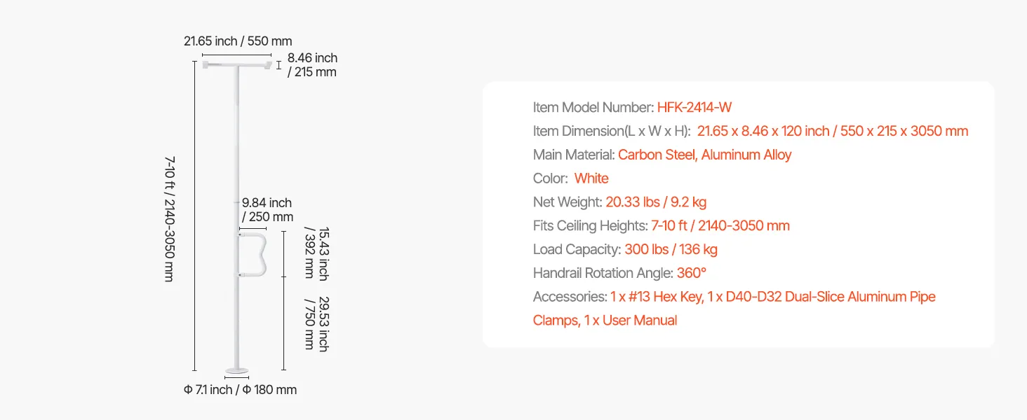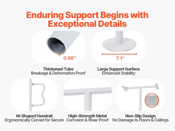 Adjustable for 7-10 ft Ceilings: Our floor-to-ceiling grab bar can be adjusted to accommodate different ceiling heights based on your specific needs. It is compatible with heights as low as 7 ft for bathrooms and restrooms, and up to 10 ft for spaces like dining rooms and living rooms