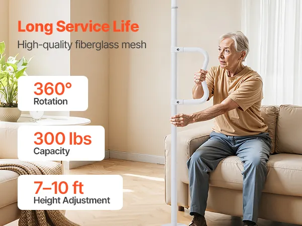 Our floor-to-ceiling grab bar has a robust support capacity of 300 lbs, ensuring usage in bedroom, bathroom, restroom, etc. With 7-10 ft adjustable height, there is no worry about ceiling height. It rotates 360° with 45° locking intervals, offering ideal support angle by adjusting the screws.