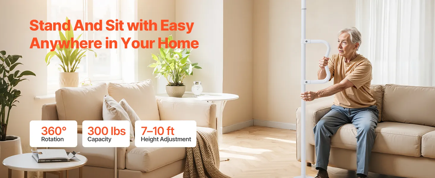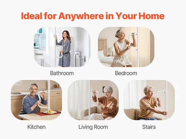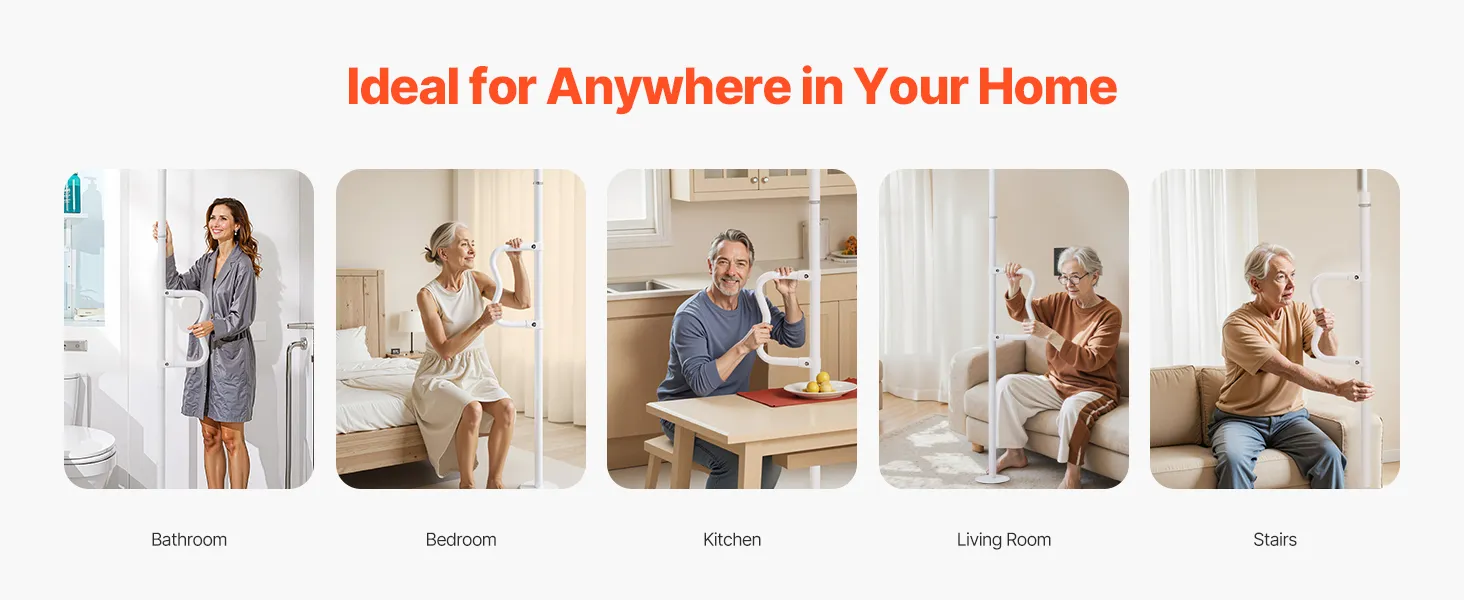 By assembling extension parts, this adjustable floor-to-ceiling pole offers 3 height settings, suitable for installation in bathrooms, bedrooms, and living rooms. It can be quickly disassembled and reassembled for use in different settings, accommodating family members with limited mobility.