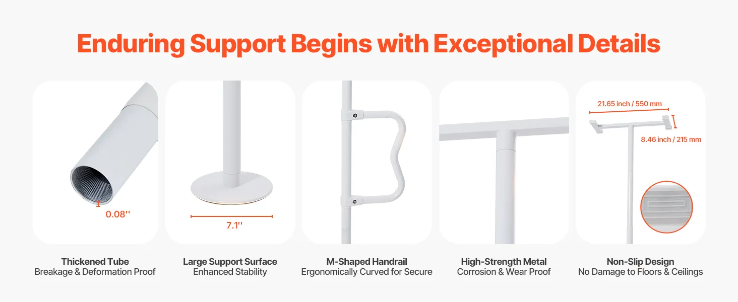 300 lbs Weight Capacity: This floor-standing safety handrail can support up to 300 lbs. With thick-walled tubing and extended handrails, it provides a strong support range, allowing you to confidently use the safety handrail in various locations