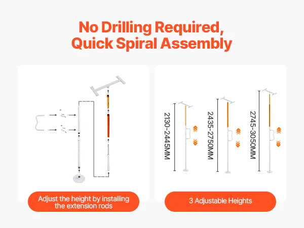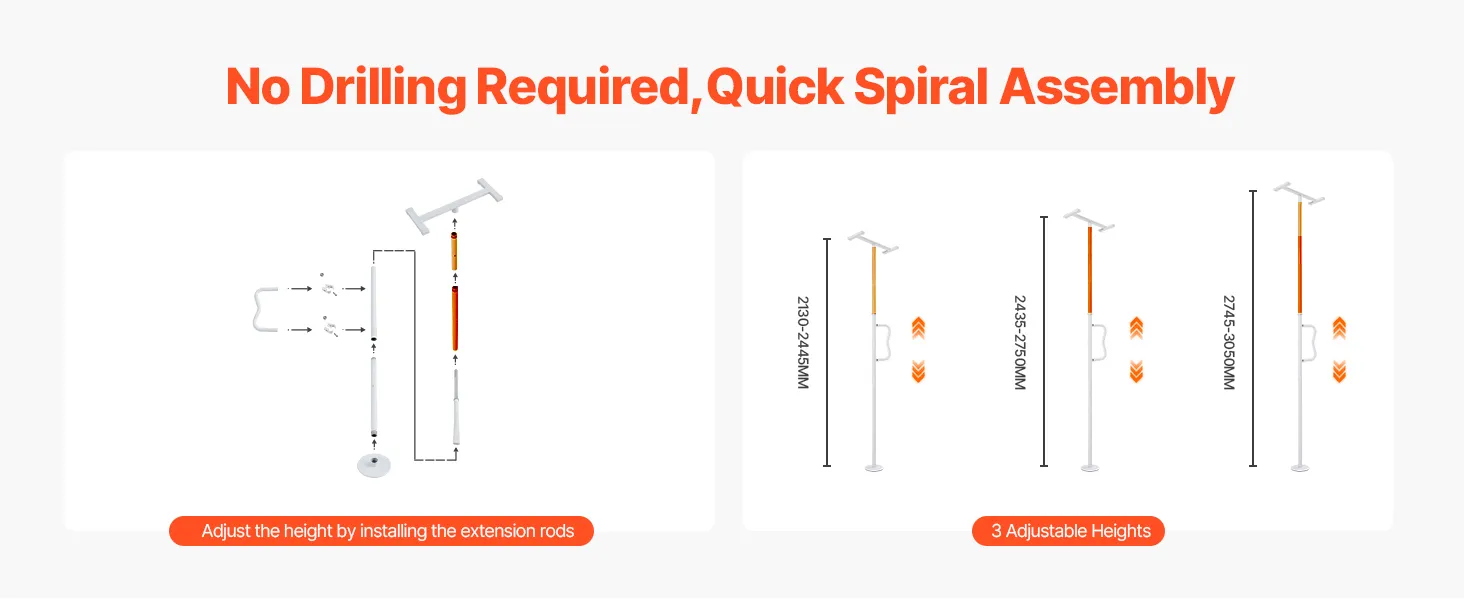 Our transfer pole comes with a complete set of assembly accessories. The simple screw rotation assembly allows installation without drilling. You can choose to assemble with Extension Rod A or Extension Rod B based on the height from ceiling to floor, ensuring an ideal fit for your space.