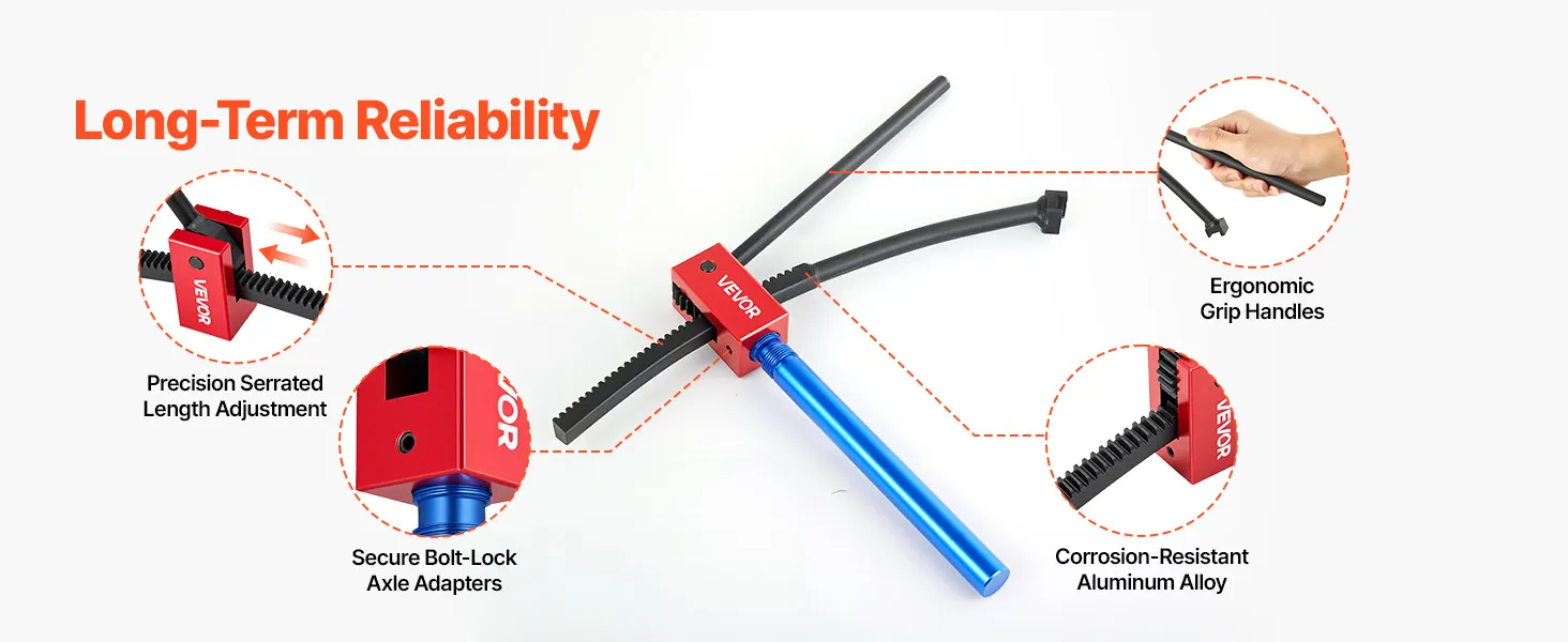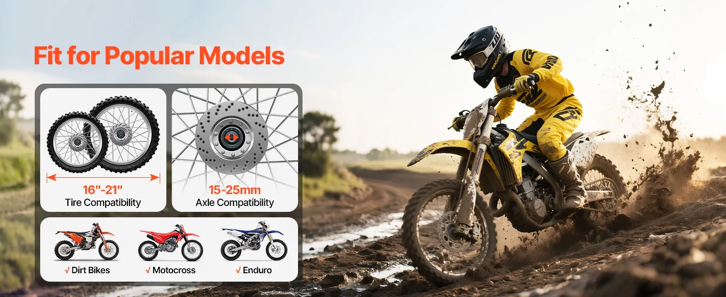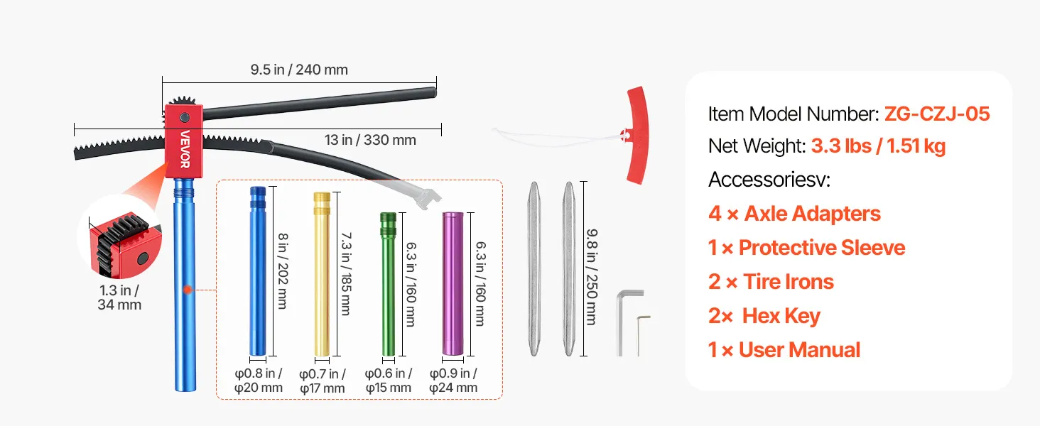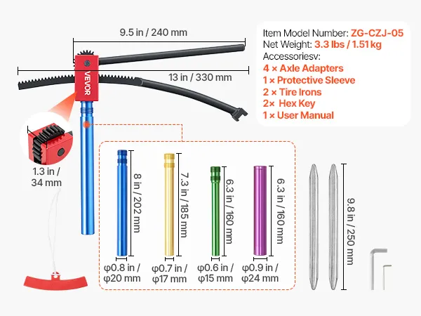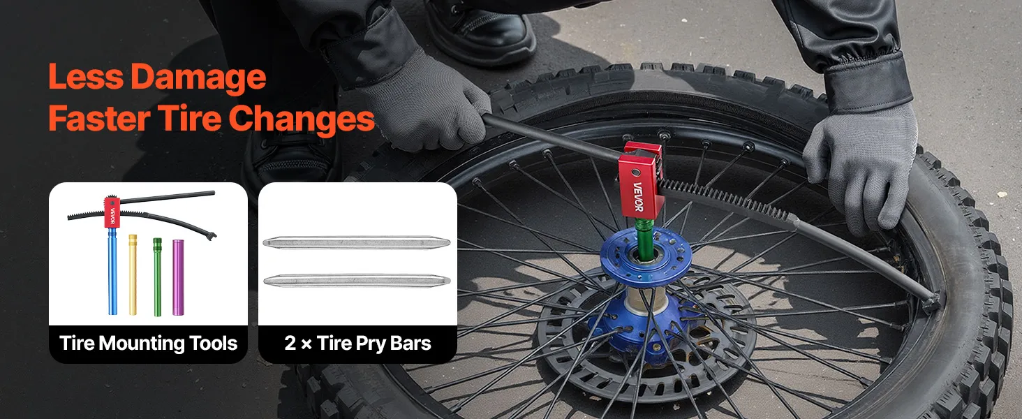 Geschikt voor bandenmaten van 16-21 inch: De getande, gebogen hendel past zich eenvoudig aan de bandenmaat aan en is geschikt voor banden van 16-21 inch (406-533 mm). Dit gereedschap voor het wisselen van crossmotorbanden wordt geleverd met 4 asadapters voor asdiameters van 15-25 mm (0,6-1 inch).