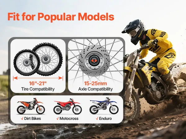 De verstelbare basis is geschikt voor wielmaten van 16 tot 21 inch. Ons gereedschap voor het wisselen van crossmotorbanden wordt geleverd met vier asadapters voor naafdiameters van 15 tot 25 mm (0,6 tot 1 inch), waardoor een veilige montage zonder gereedschap mogelijk is voor een breed scala aan crossmotoren.