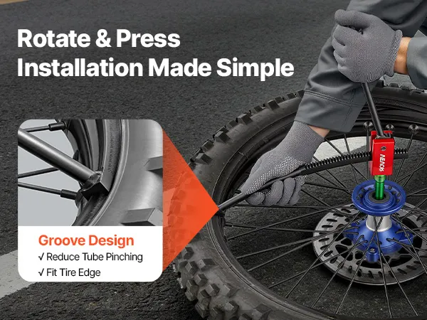 De bandenwisselaar voor crossmotoren heeft een speciaal groefontwerp waardoor banden binnen enkele minuten soepel op de velg gemonteerd kunnen worden. Dit minimaliseert het risico dat banden of binnenbanden bekneld raken.