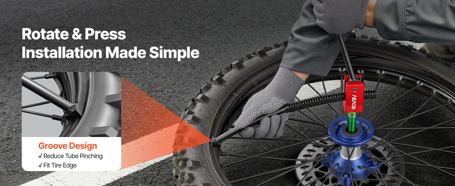 Minder geknelde binnenbanden: Deze bandenwisselset voor crossmotoren maakt het mogelijk om banden krasvrij te wisselen. Het speciale groefontwerp zorgt voor een snelle en veilige montage van de band op de velg en vermindert schade aan de band en binnenband. Dit minimaliseert het risico op snijwonden.