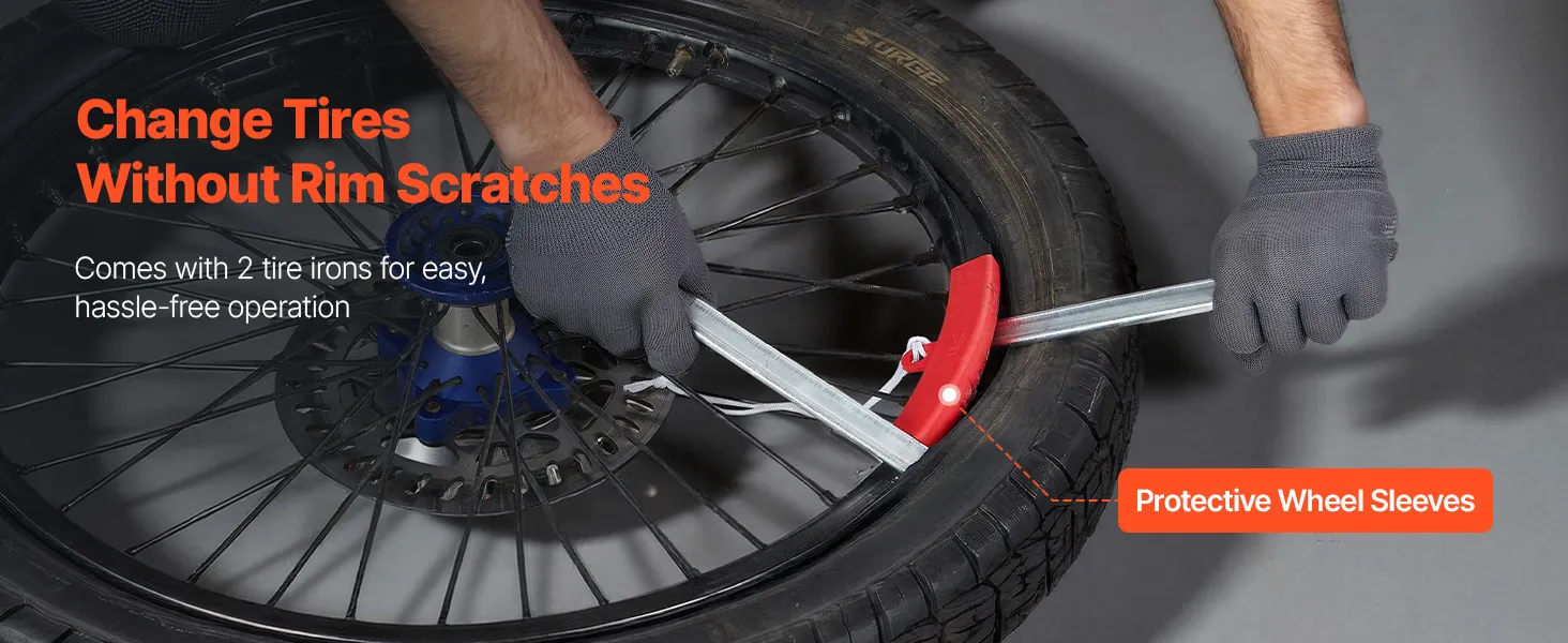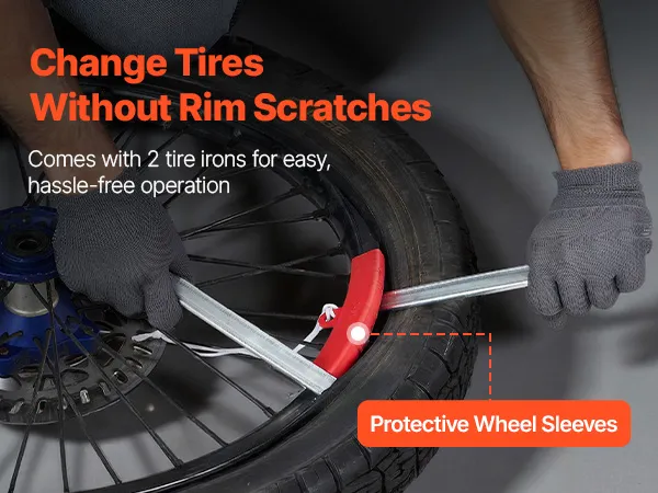 Zelfs de meest hardnekkige banden worden met gemak gewisseld. Deze bandenwisselaar voor motorfietsen is voorzien van twee robuuste stalen bandenlichters die niet buigen of breken, en een velgbeschermer om krassen en beschadigingen tijdens gebruik te voorkomen.