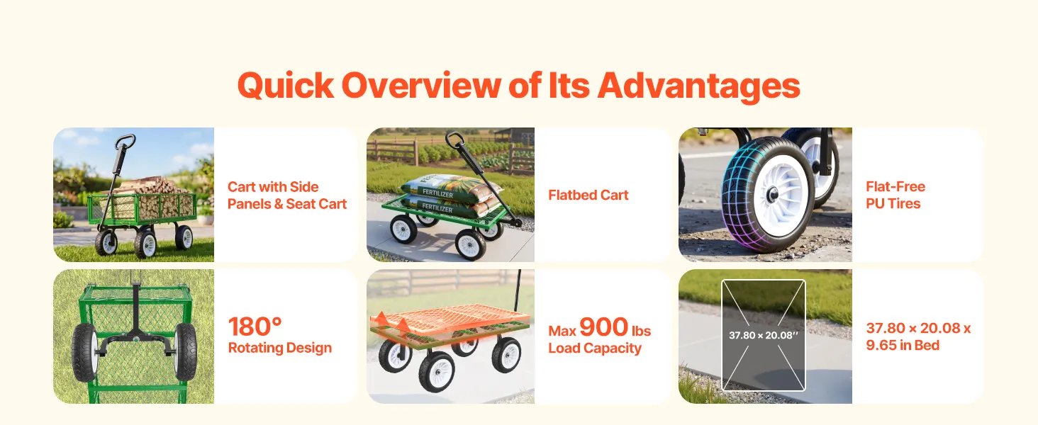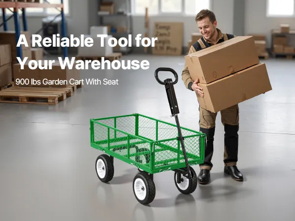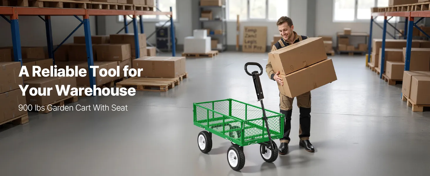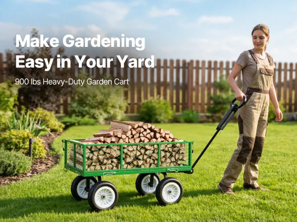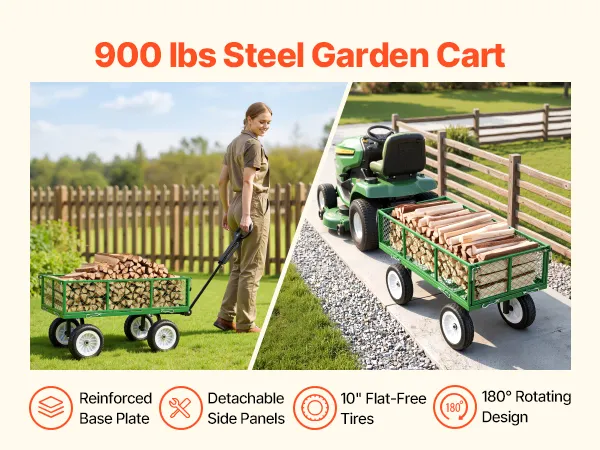 Deze tuinkar is voorzien van PU-banden en een verstelbare handgreep. Dankzij het versterkte stalen frame kan hij tot 408,2 kg dragen. De afneembare zijpanelen transformeren de kar snel in een laadplatform voor het vervoeren van grote of zware voorwerpen.
