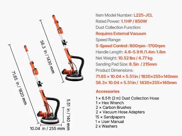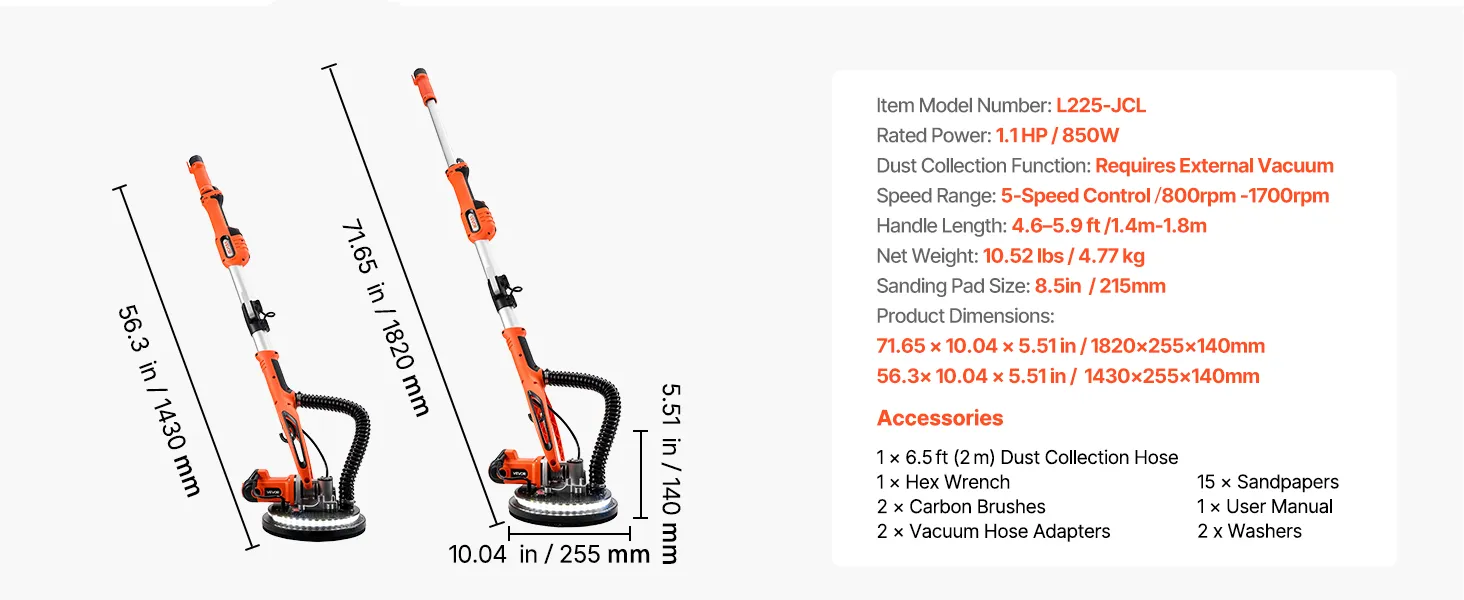 VEVOR Gipsplaatschuurmachine 850 W, Plafondschuurmachine met 255 mm schuurschijf, Schuurmachine met lange steel en een toerental van 800–1700 rpm, Dubbelwandige LED-verlichting, Uitschuifbare handgreep, 15 schuurschijven, Stofslang