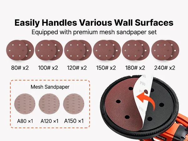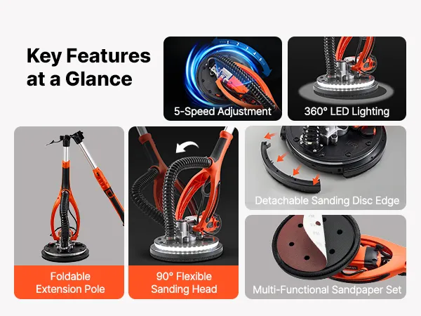 Flexibele bediening: Onze elektrische plafondschuurmachine is ontworpen voor maximale wendbaarheid dankzij een 360° draaibare schuurschijf, een 90° zwenkbare handgreep en een afneembare voet. Hierdoor bereikt u gemakkelijk krappe hoeken, randen en smalle kieren.