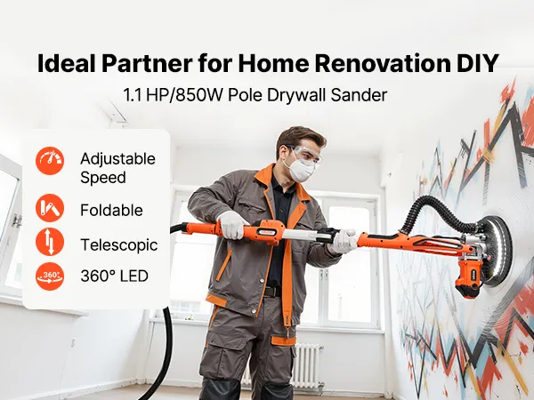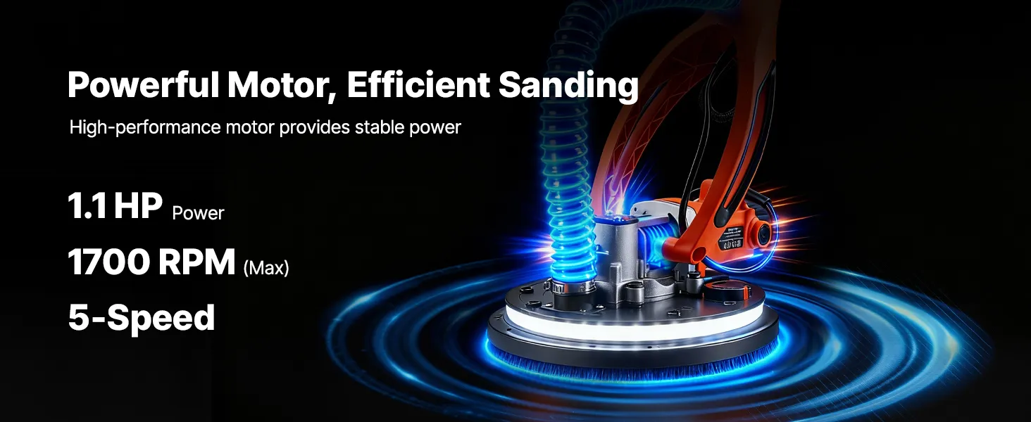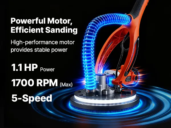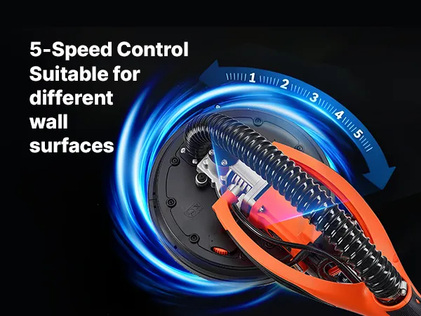 Krachtige 1,1 pk motor: Deze gipsplaatschuurmachine is voorzien van een robuuste motor met een toerental tot 1700 tpm en 5 instelbare snelheidsstanden. Ideaal voor wanden, vloeren en plafonds; hij pakt moeiteloos en nauwkeurig dunne plamuurlagen, dikke verflagen en beschadigde oppervlakken aan.