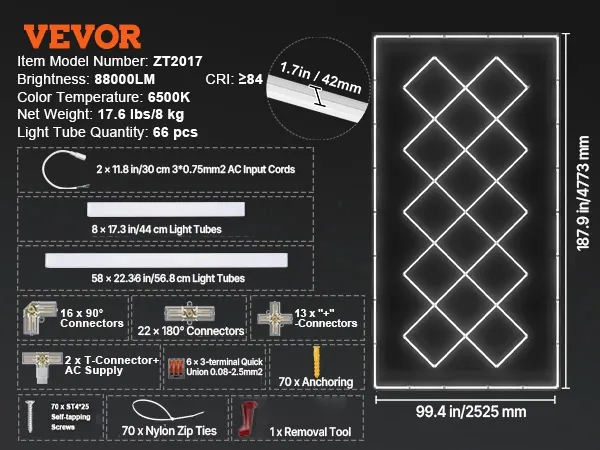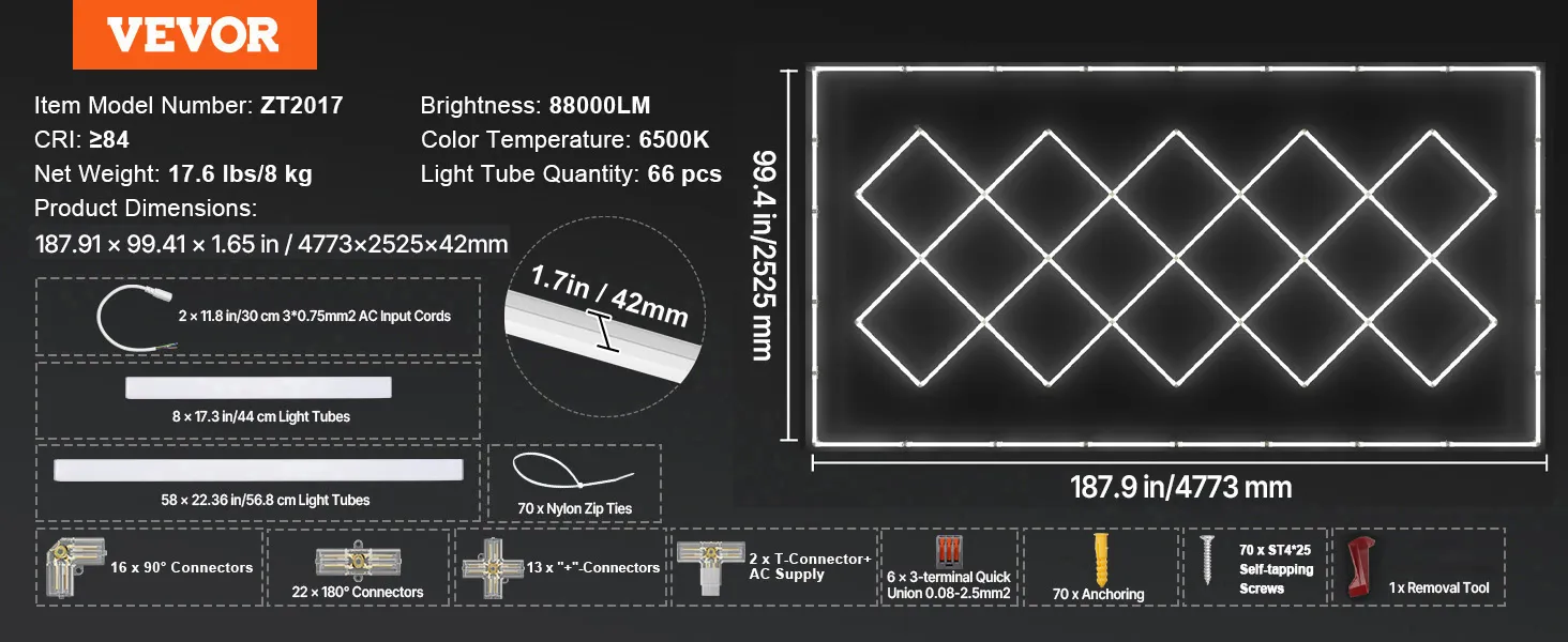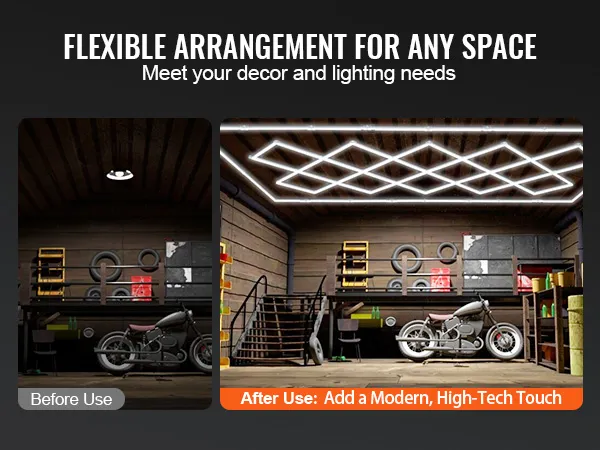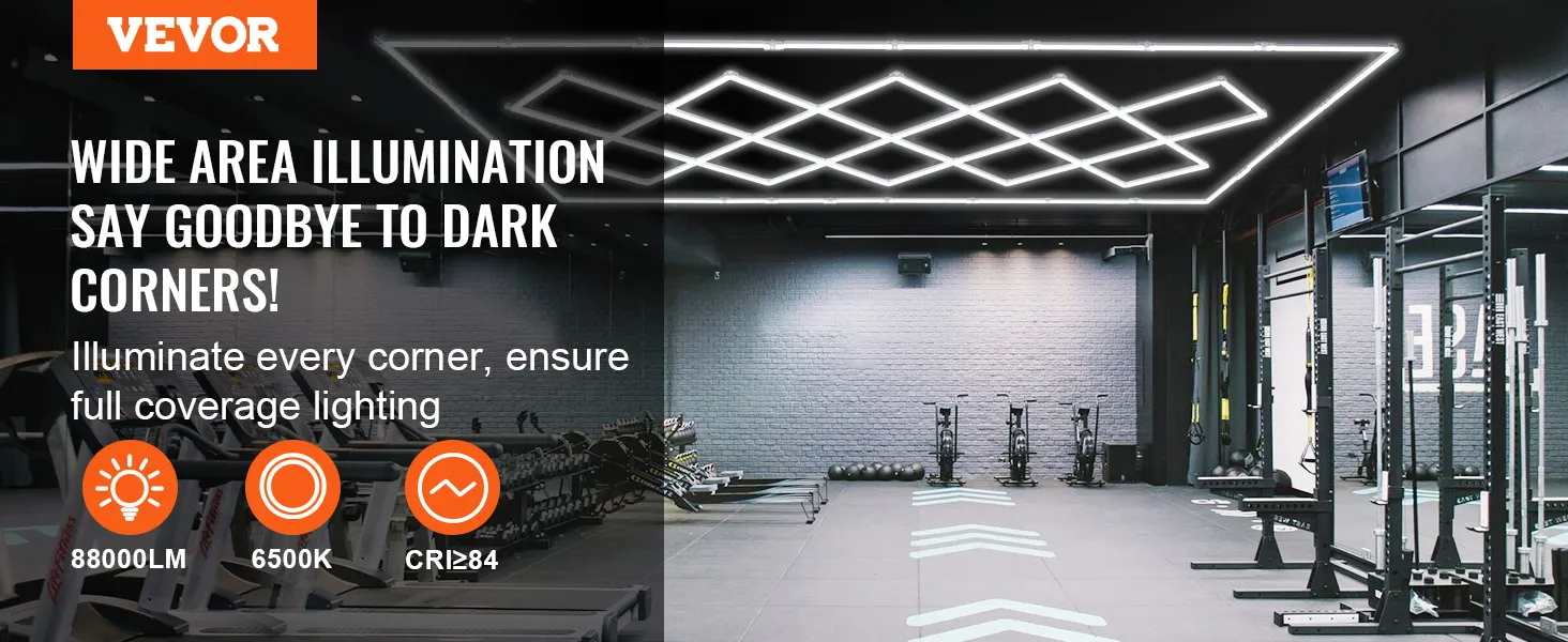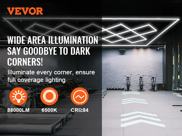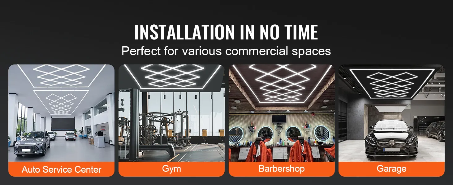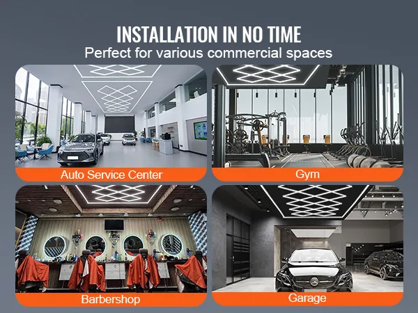 Deze garagelampen leveren 88.000 lumen met een kleurtemperatuur van 6500K die natuurlijk licht nabootst en een CRI van ≥84, waardoor de glanzende lak van uw auto opvalt. Je kunt ze verdelen in 14 vierkante rasterpatronen om een modern tintje toe te voegen.