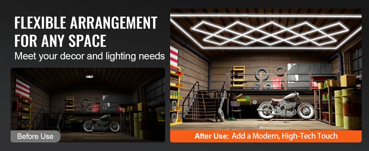 Deze zeshoekige garageplafondlamp is ontworpen voor maximale dekking en minimaliseert donkere plekken, zodat elke hoek goed verlicht is. Het verhoogt niet alleen de efficiëntie en veiligheid, maar zorgt er ook voor dat uw auto of goederen er helderder en eleganter uitzien.